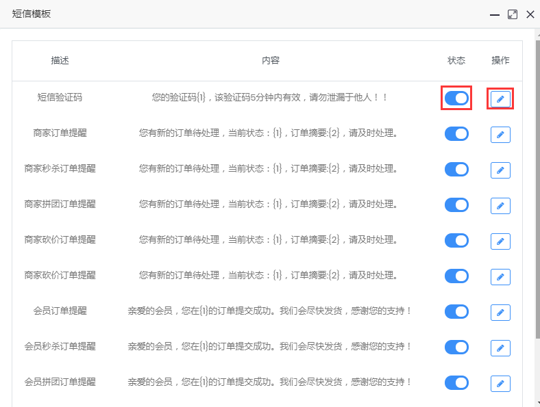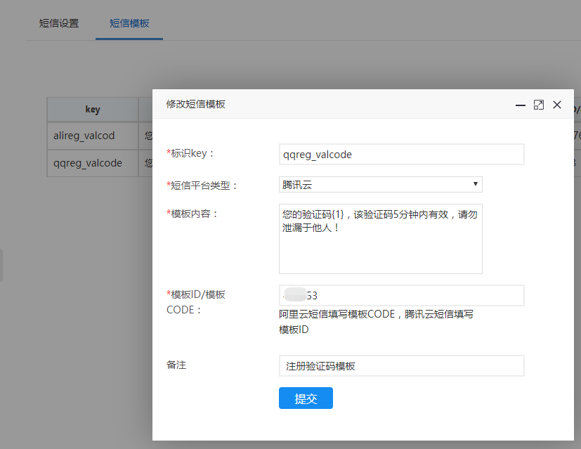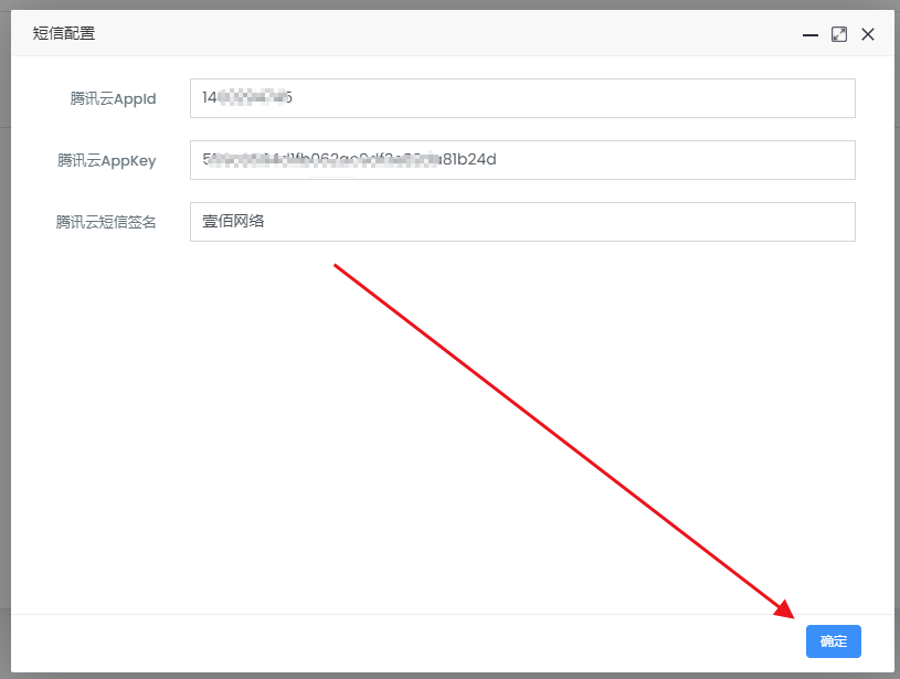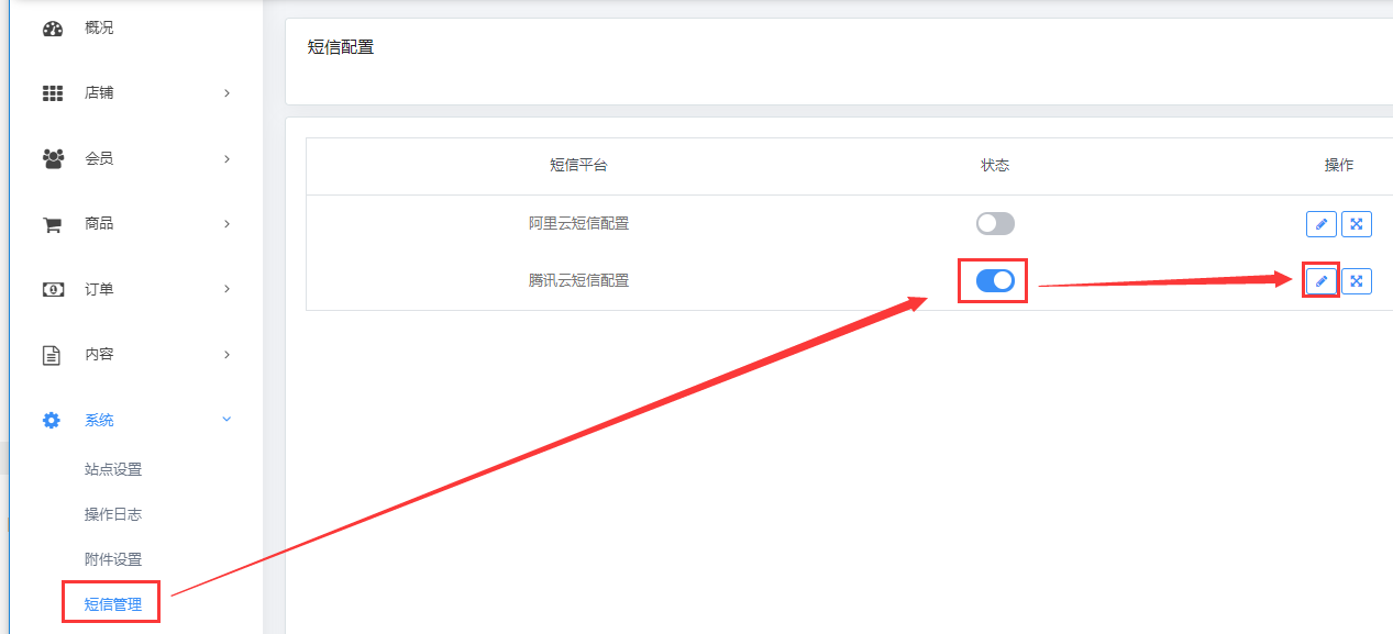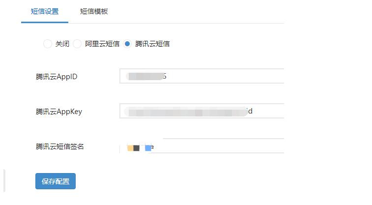 一、登录腾讯云账号,在控制台首页搜索“短信”或是下方的“短信”快捷方式,登录短信服务控制台。(需要提前购买短信服务套餐)  二、【应用管理】-【创建应用】   三、【国内短信】-【创建签名】   四、【正文模板管理】-【创建正文模板】,可选用系统的标准模板   五、等签名和模板审核通过之后,将AppID、AppKey、短信签名、短信模板复制到后台的短信配置页面    下图是独立版框架的相关截图,未来云店短信配置请参考第六部分。   六、未来云店后台短信配置类似,编辑短信配置,填写APPID、AppKey、短信签名   编辑短信模板,在弹出的页面中开启并编辑短信模板