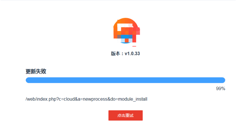 如图所示,安装未来云店时进度到99%提示安装失败,点击重试 解决办法,登录宝塔面板,检查当前站点PHP是否安装ionCube插件,如果已安装,卸载重新安装,然后重启PHP即可。