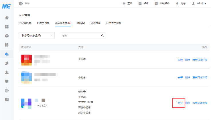 登录未来鸟引擎站点后台,点击左侧菜单“应用管理”,在打开的页面选择“未安装列表”,找到“未来鸟未来云店”,点击后边的“安装”字样。 提示:安装前需要确认服务器上已安装PHP插件ionCube最新版本。  选择需要安装的功能,点击确定  下一步,确认安装