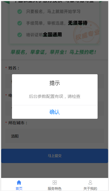 如图所示,在H5页面上填写完表单,提交时提示“后台参数配置有误,请检查” 由于填写表单需要获取用户信息,目前建议是配置公众号信息,然后在微信内填写相关的表单。 等后续H5相关的会员体系上线后可解决H5的表单问题。