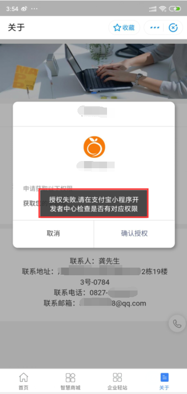 支付宝小程序授权失败,提示在开中心检查对应权限