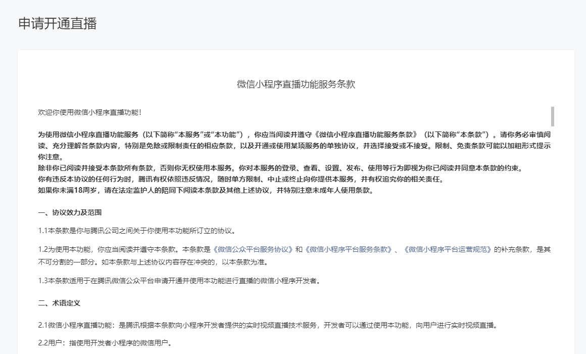 一、登录符合开通【直播】条件的微信小程序公众平台,点击【功能】-【直播】,可看到【开通】按钮,点击相关按钮,阅读服务条款,【申请开通】即可     二、在【设置】-【第三方设置】页面添加【小程序直播组件】