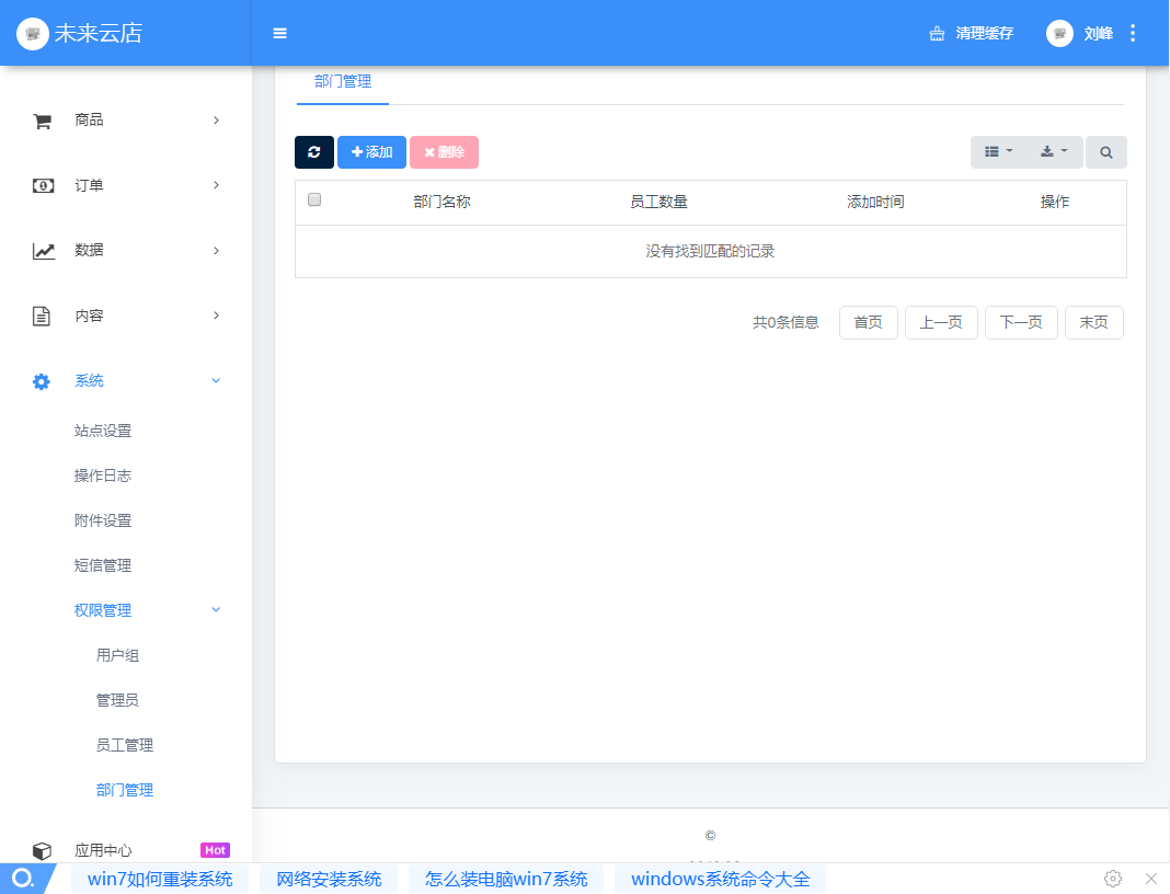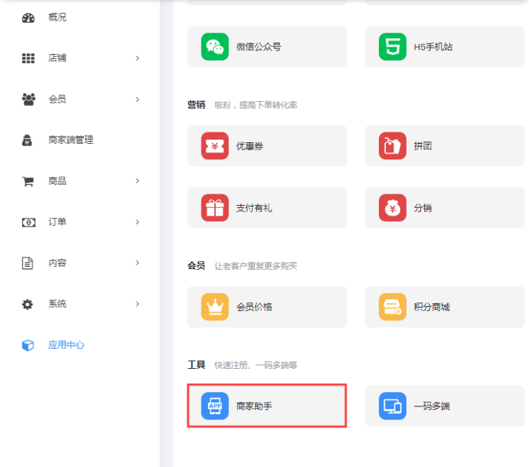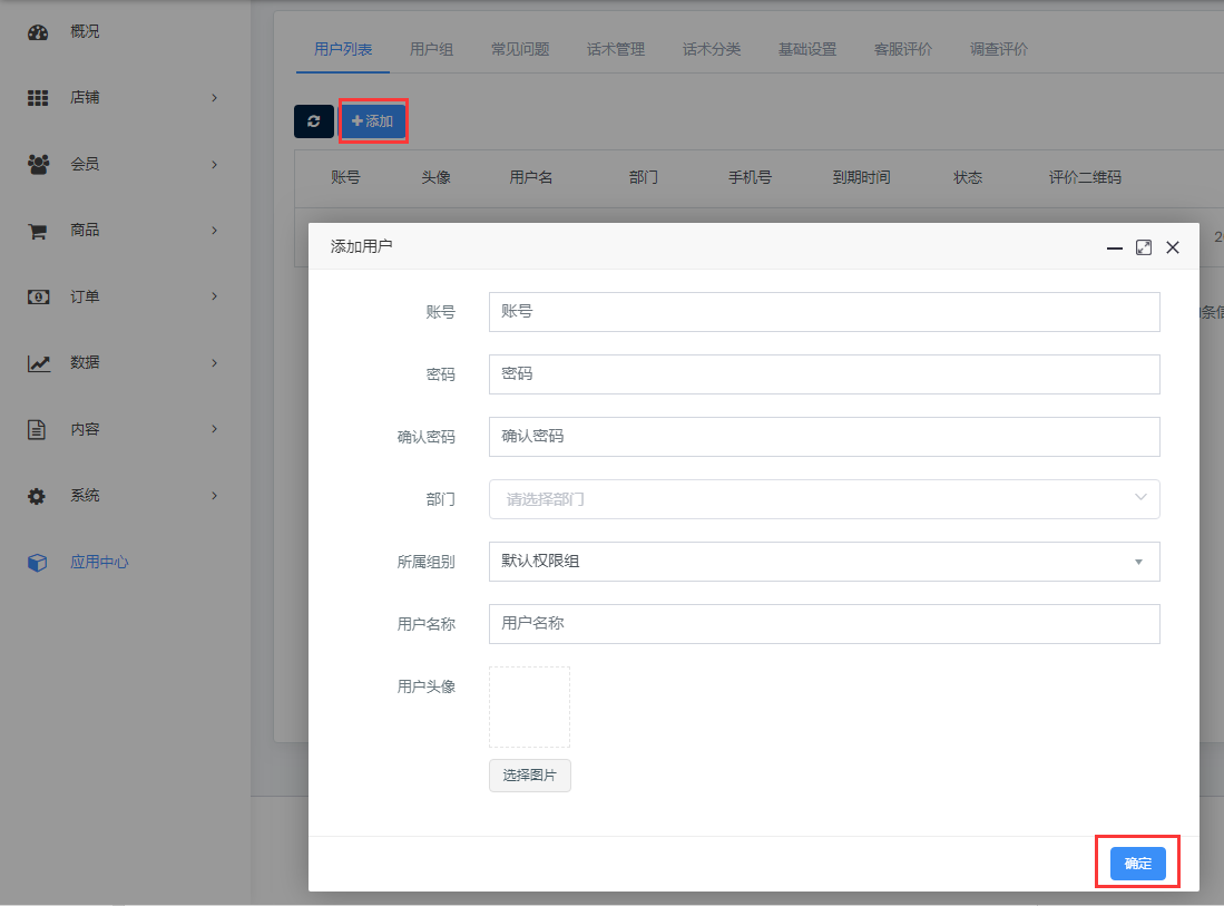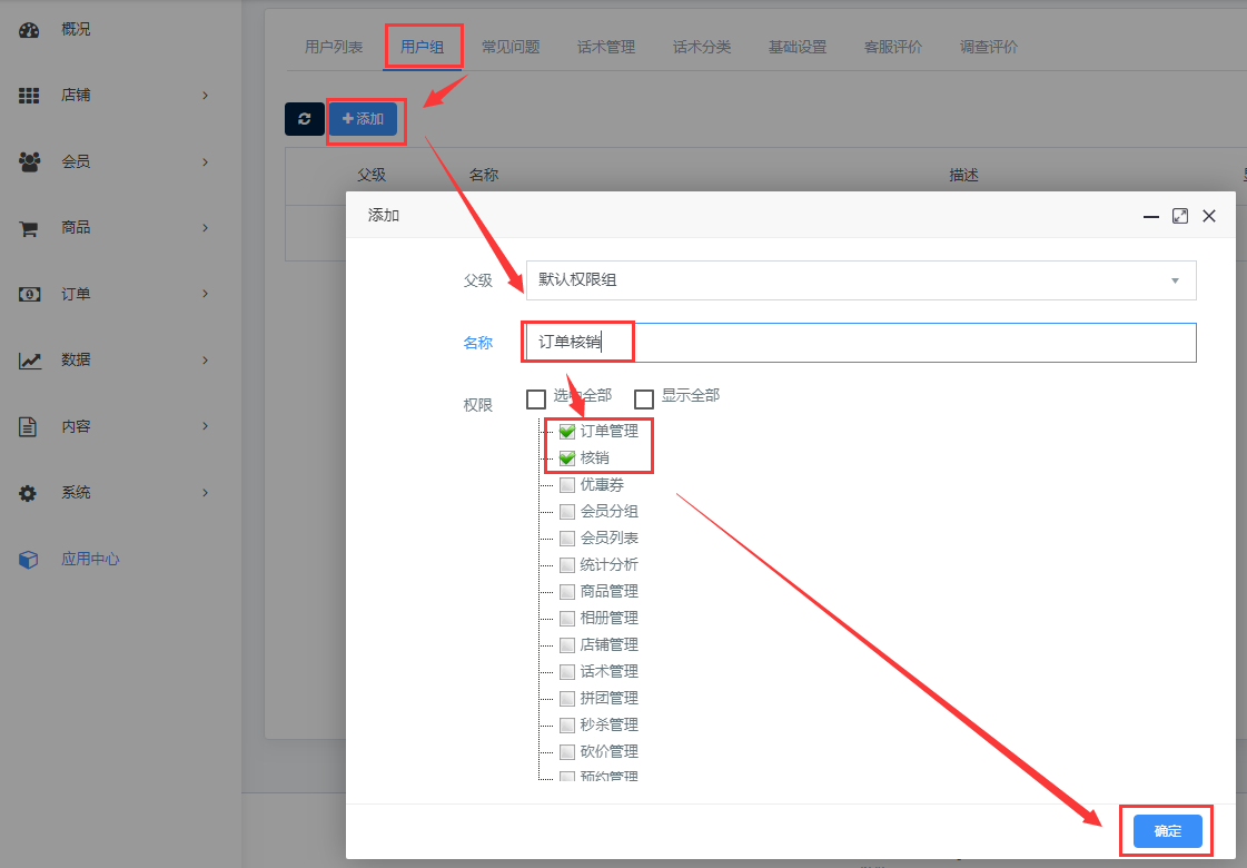 一、打开未来云店后台打开【系统】-【权限管理】-【部门管理】页面,添加部门   二、打开【应用中心】-【商家助手】页面  三、在商家助手页面,点击【用户组】选项卡,添加用户组,在弹出窗口中填写用户组名称,设置好用户权限,然后【确定】提交  四、在用户列表页面点击【添加】按钮,设置相关的账号、密码、部门、权限组(此账号为商家在【商家助手】小程序端登录的账号)  添加之后需要联系商家助手管理员,进行账号审核,只有审核通过的账号,才可以登录商家助手小程序