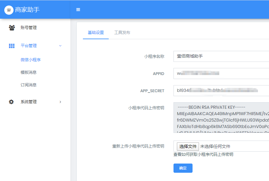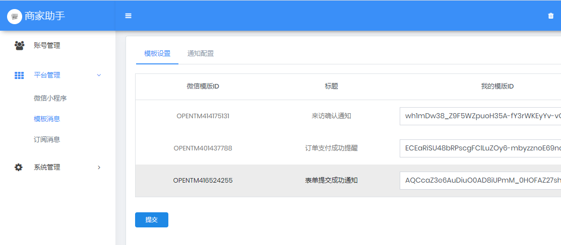 商家助手小程序类目请选择“工具 > 办公” 和“IT科技 > 软件服务提供商” 商家助手应用需要配置一个全新的小程序,有几点和未来云店小程序配置流程一样的,可参考未来云店小程序 (1)、登录小程序公众平台填写服务器域名 (2)、获取小程序APPID,生成小程序密钥 (3)、生成上传密钥并下载KEY文件,关闭上传IP白名单 一、安装商家助手插件,使用管理员账号,创建商家助手小程序应用(独立版需要先创建商家助手功能套餐)(商家助手应用为站点管理员专用,目前是单开应用,无须创建多个)  二、打开对对应的小程序应用,可查看商家提交的商家助手账号申请,可进行审核及到期时间设置  三、商家助手小程序提交审核,打开【平台管理】-【微信小程序】-【基础设置】,填写小程序相关信息,提交审核 小程序审核通过之后,商家可通过此小程序登录商家账号(所有商家共用一个商家助手小程序)  四、开启并配置一下公众号模板消息,商家可收到相关的公众号推送提醒消息  五、以【表单提交成功】模板为例,公众号后台模板消息页面先根据名称搜索【表单提交成功】,找到编号为【OPENTM416524255】的模板,然后添加此模板(登录微信公众平台,行业需为【IT科技/IT软件与服务】)   六、然后在【我的模板】页面找到生成的模板ID,复制填写到后台对应【我的模板ID】文本框中   七、需要执行如下操作,方可收到公众号消息提醒: (1)、公众号需要关联商家助手小程序 (2)、商家(接收消息提醒的微信)需关注公众号之后 (3)、 公众号和商家助手小程序须是同一主体 (4)、公众号须为已认证的公众号   八、商家助手小程序体验版路径:pages/index/index