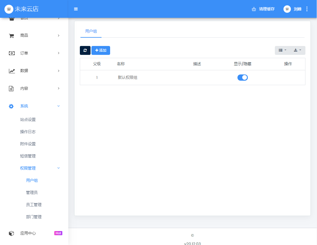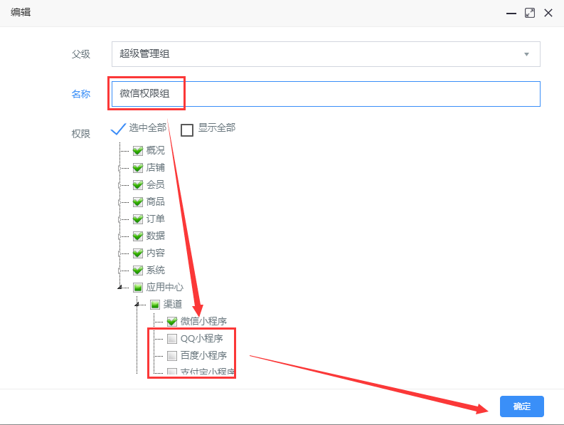 一、登录独立版系统后台,打开有【用户列表】-【添加用户】,本教程以设置用户仅使用微信端功能为例。  二、打开小程序应用列表,进入已经添加好的小程序应用后台  三、在未来云店后台,点击【系统】-【权限管理】-【用户组】,点击【添加】按钮  四、在弹出窗口中填写权限组名称,然后将渠道中【微信小程序】之外的权限取消掉,然后保存  五、返回独立版系统管理界面,打开【功能套餐】页面,点击【添加套餐】,设置好套餐名称、套餐缩微图、选择未来云店应用,权限选择刚创建好的【微信权限组】,填写好时长及套餐价格,点击【确定】提交即可  六、在用户列表找到刚创建好的用户账号,为用户创建小程序应用,选择刚创建好的套餐  七、普通用户登录未来云店后台,编辑一下小程序信息即可体验相关权限