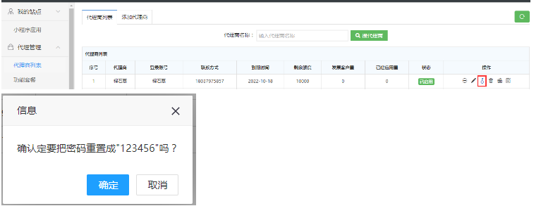 如果代理商密码遗忘,可以点击密码重置按钮,进行登录密码重置操作