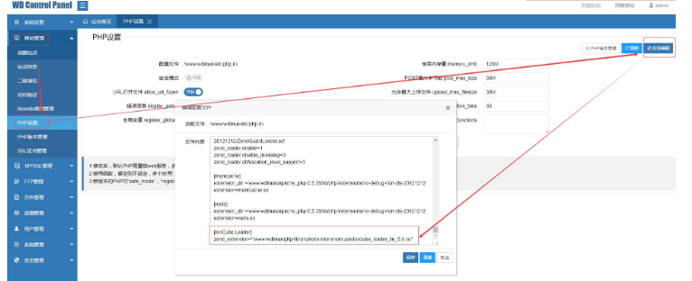 一、根据你的linux系统位数32/64BIT版本,下载ioncube,然后移动到extensions目录下,找到对应的目录文件。 A – 32位系统 wget http://downloads3.ioncube.com/loader_downloads/ioncube_loaders_lin_x86.tar.gz tar -zxvf ioncube_loaders_lin_x86.tar.gz mv ioncube /www/wdlinux/php/lib/php/extensions B – 64位系统 wget http://downloads3.ioncube.com/loader_downloads/ioncube_loaders_lin_x86-64.tar.gz tar -zxvf ioncube_loaders_lin_x86-64.tar.gz mv ioncube /www/wdlinux/php/lib/php/extensions 二、设置软件路径 在WDCP中找到php.ini文件,然后将放在最下面保存,在重启下服务器。 [ionCube Loader] zend_extension=”/www/wdlinux/php/lib/php/extensions/ioncube/ioncube_loader_lin_5.6.so” 安装ionCube Loader