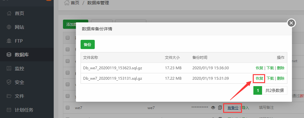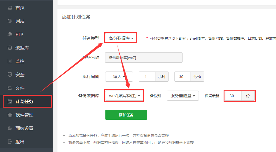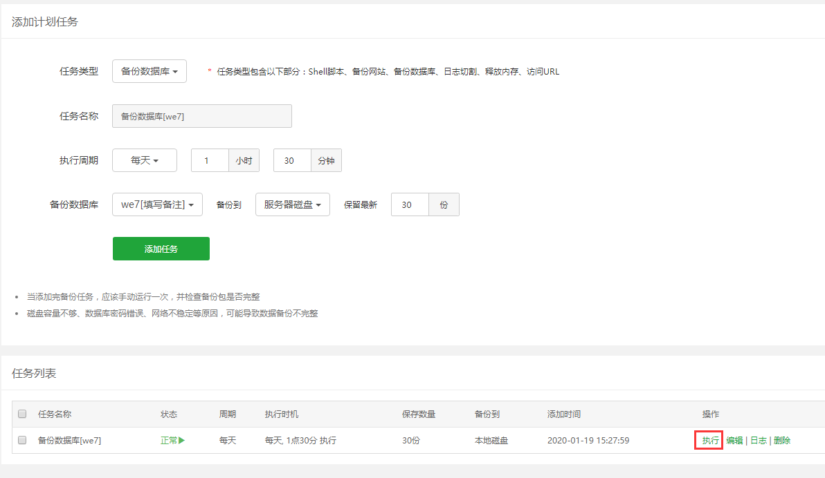 一、登录宝塔面板,打开【计划任务】,任务类型选择【备份数据库】,设置备份周期,如【每天】,选择需要备份的数据库,每天备份的话,建议保留最新【30份】,点击【添加任务】  二、在任务列表找到刚创建好的任务,操作【执行】  三、打开数据库管理页面,查看数据库备份文件是否创建成功,以及数据库大小是否异常,一般几B或几K的数据库大小是有问题的,可再次手动执行备份。(如果数据库较大的话,可能会有一分钟左右的延迟)  四、根据需要可对数据库进行备份【恢复】操作