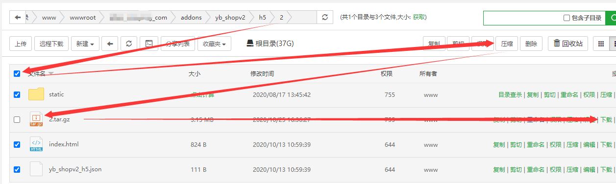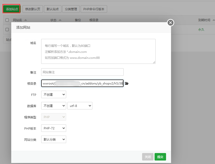 一、域名需备案,并解析到当前服务器 二、登录后台查看H5页面路径   三、登录宝塔面板,根据H5路径找到H5页面所在的文件夹路径,并复制  三、新建站点,填写解析好的域名,将复制好的文件夹路径粘贴到【根目录】,【PHP版本】选择跟未来云店同一个版本,【提交】保存即可  四、如果需要将H5站点迁移到其他服务器上,可将H5目录下的文件夹【全选-压缩-下载】,然后上传至目录服务器上创建站点解压即可(下图需要多步操作,并非一步完成)