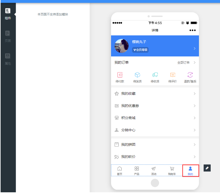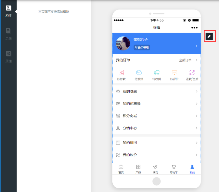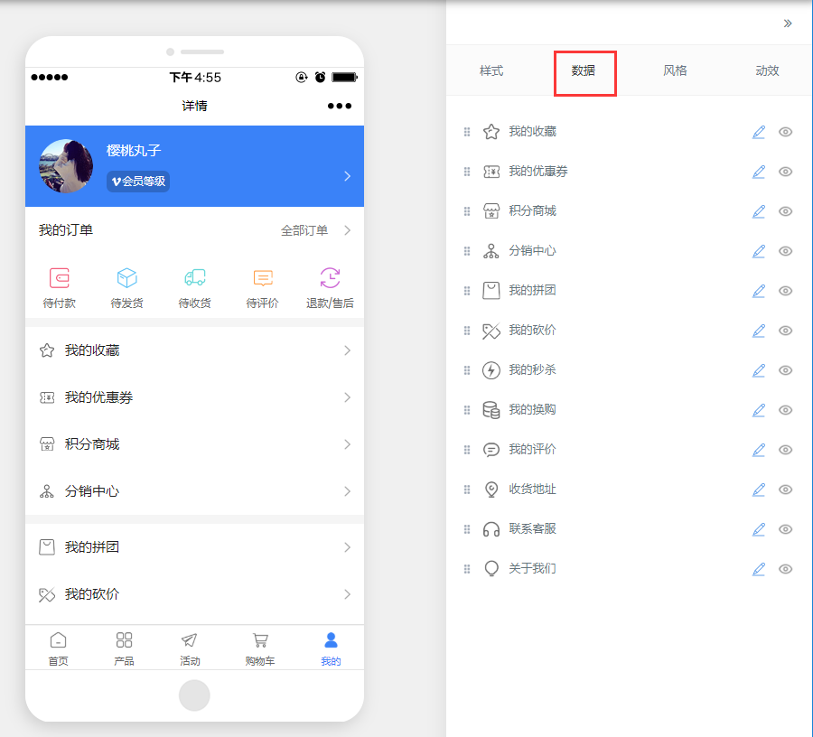 一、登录未来云店系统后台,点击【我的模板】-【站点设计】  二、点击底部菜单【我的】进入会员中心页面  三、点击会员中心页面的编辑按钮  四、点击【数据】选项卡,可以相关菜单的名称、图标及是否显示进行修改调整(点击眼睛图标可控制相关菜单是否是显示/隐藏)