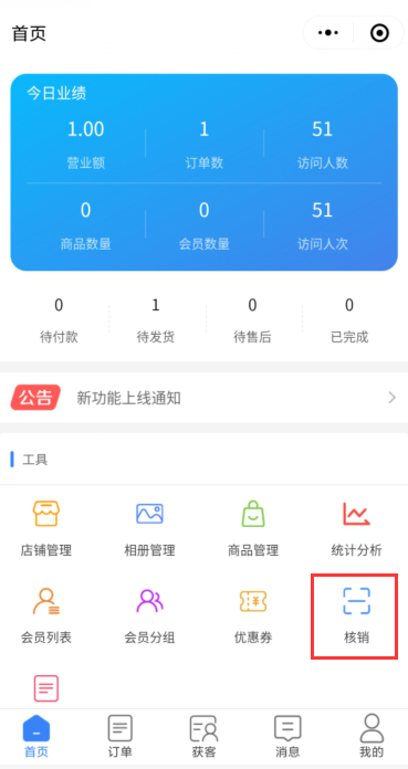 一、PC端核销 根据用户提供的自提订单的订单号或是卖家姓名、手机号搜索订单,进行【核销】  二、商家助手核销 登录商家助手小程序,点击首页的核销按钮,对用户提供的自提订单二维码进行核销