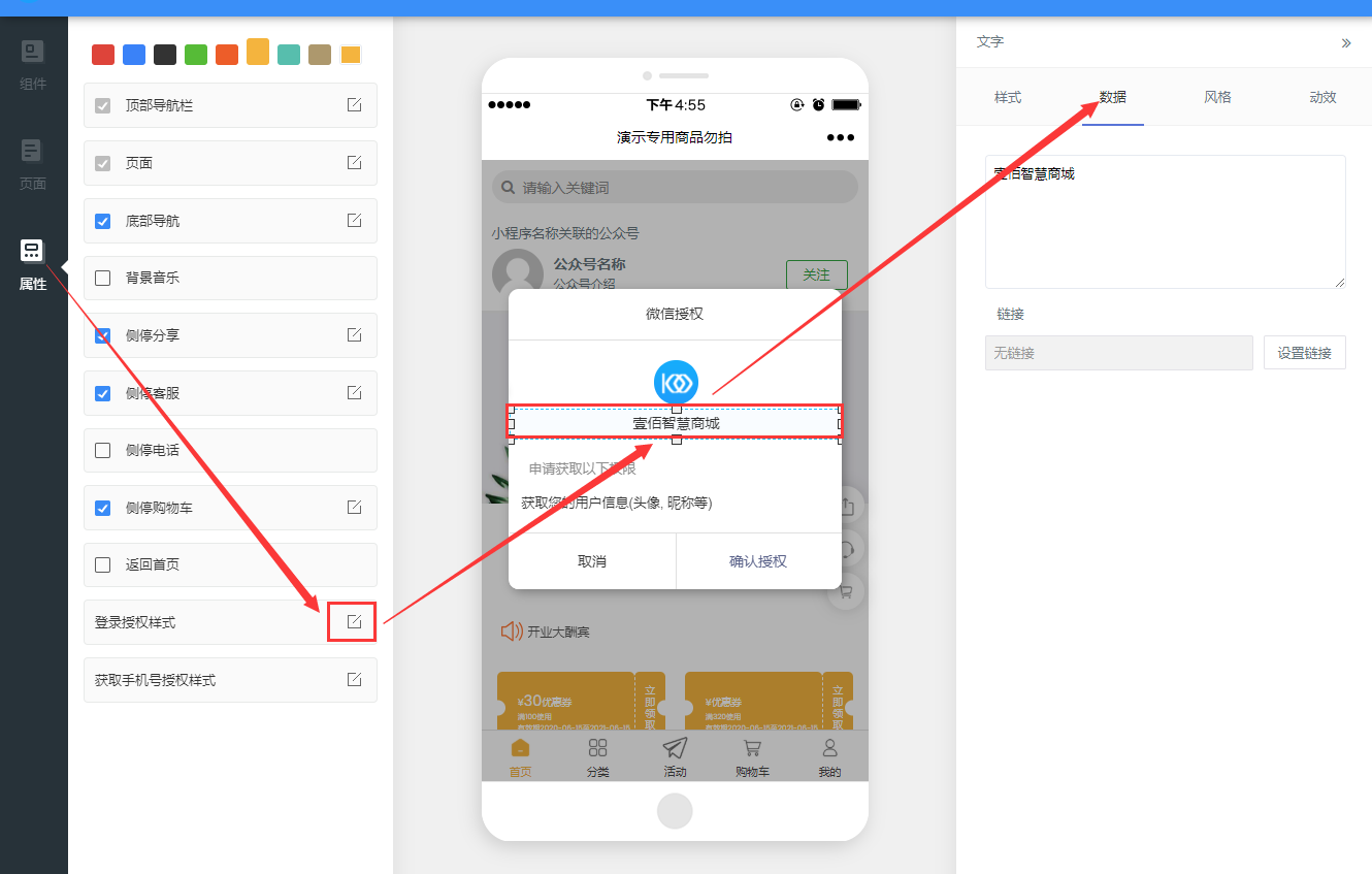 1、店铺——我的模板——站点设计——属性——登录授权—选中需要修改的内容——右侧进行修改——点击容器——保存  小程序名称和LOGO图片修改是同样的原理,选中图片或文字在右侧属性面板中编辑即可