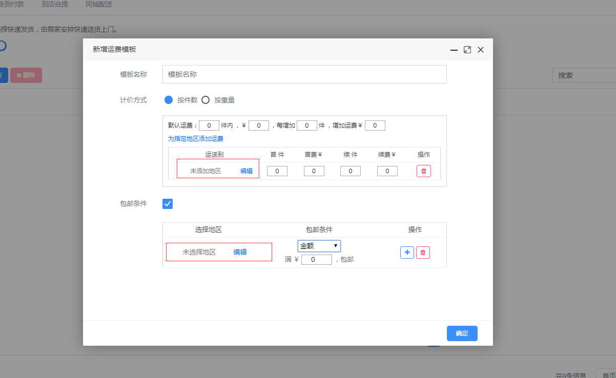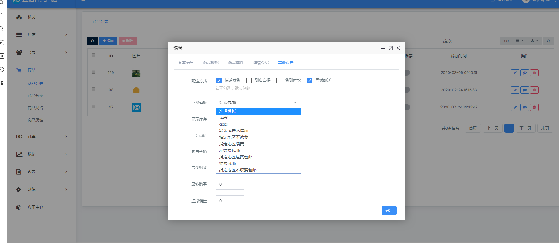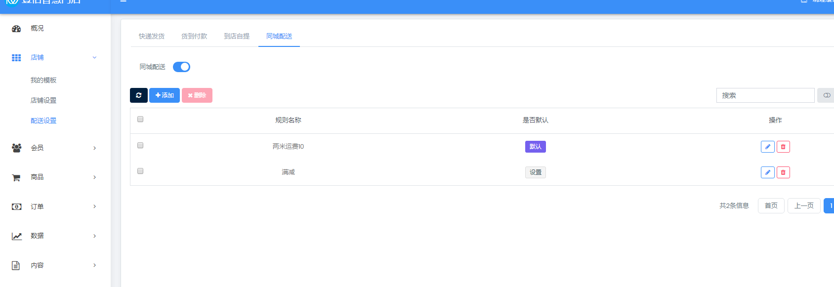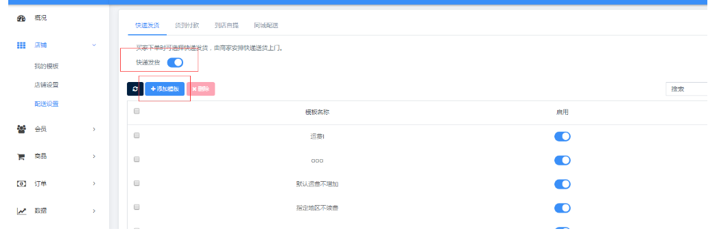 点击店铺——选择配送方式 一、快递配送 1、开启状态按钮——添加运费模块  2、添加规格属性,可以具体到每个地区的运费规则。  3、添加完成需在商品列表对应具体商品进行添加。  二、到店自提 1、开启状态按钮——添加自提点。 2、添加完成需在商品列表对应具体商品进行添加。  三、同城配送 1、开启状态按钮——添加运费模块  2、添加规格属性,(距离计算,为可行走路线距离,非直线距离)   3、添加完成需在商品列表对应具体商品进行添加。