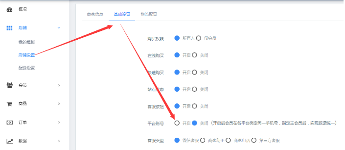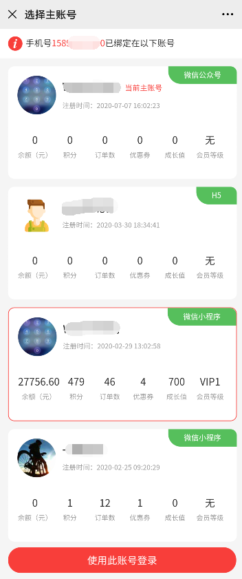 一、管理员在未来云店后台基础设置页面开启【平台账号】  二、用户在移动端(小程序及H5、公众号端)个人中心操作绑定手机号  输入手机号和验证码  系统会将自动读取系统平台上绑定该手机号的所有用户信息,提示用户选择对应的账号  三、操作绑定之后,在公众号端即可看到小程序端的所有同步信息:订单、积分、余额、优惠券等所有信息