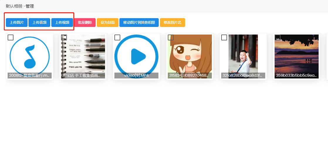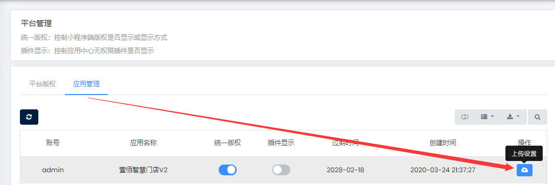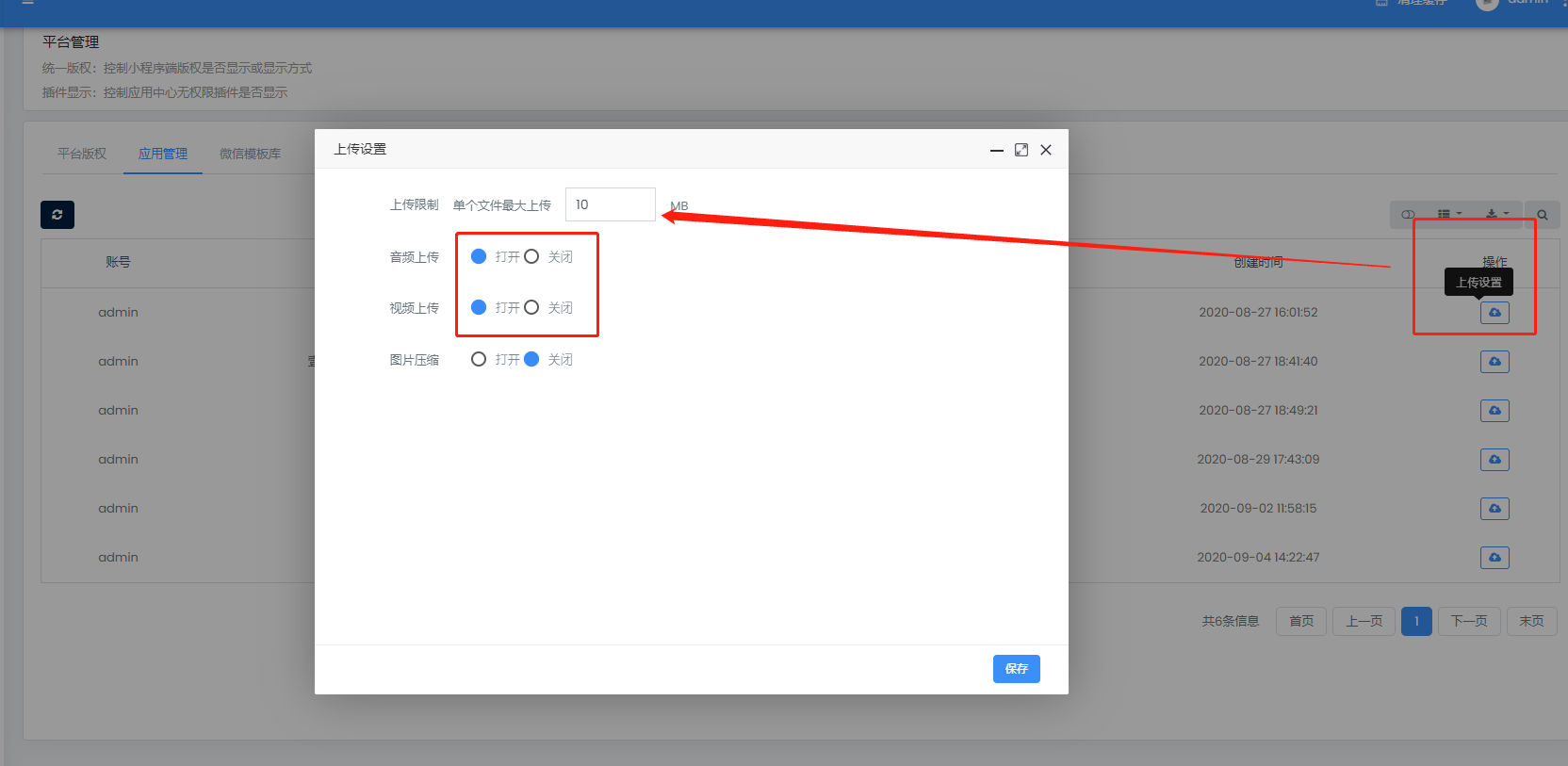 步骤一、未来云店后台打开【应用中心-平台管理】页面,  步骤二、在应用管理界面点击【上传设置】按钮   步骤三:相册管理处上传,注:仅支持知识付费插件直接使用视频及音频  步骤四:如何获取上传的视频及音频链接