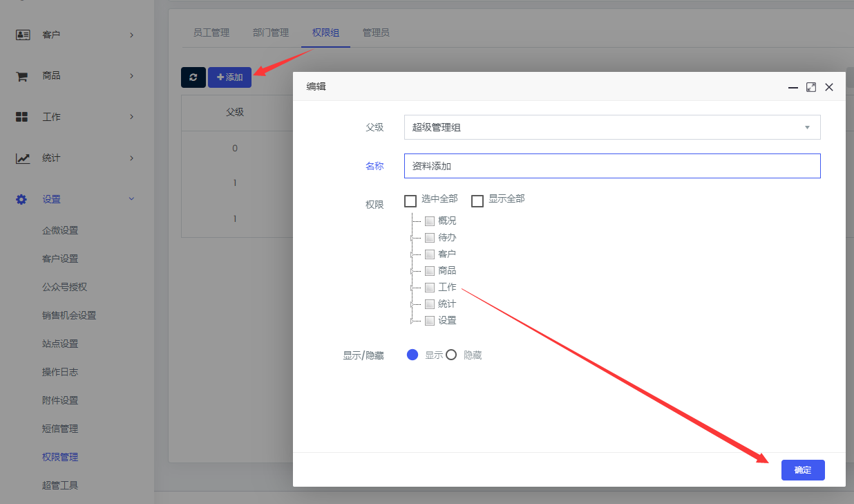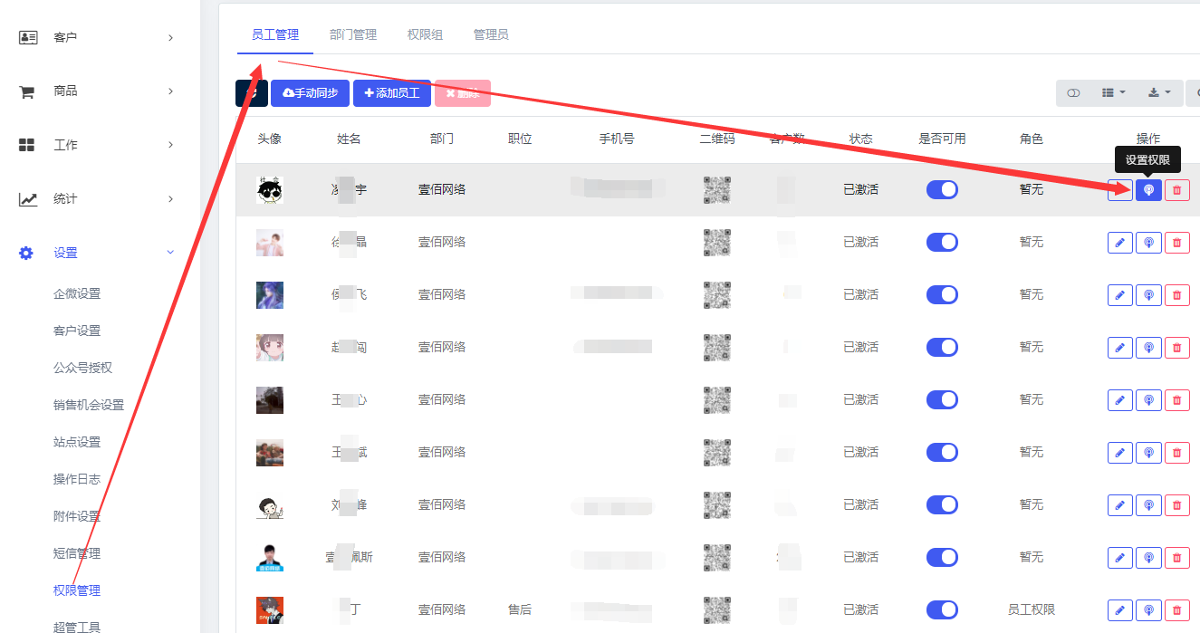 如图所示,员工账号登录后部分功能无法使用,是因为员工默认是没有登录后台权限的,开通登录后台的权限之后还需要设置不同的权限,具体解决方案如下  一、使用超管账号登录后台,设置员工权限   二、也可以为某一个或某一类员工设置单独的权限 在权限组页面点击【添加】按钮,设置好权限组名称及选择相应的权限,然后【确定】提交。  三、在工员管理页面,找到没有权限或是功能缺少的员工,点击【编辑】,选择合适的权限组,【确定】保存即可