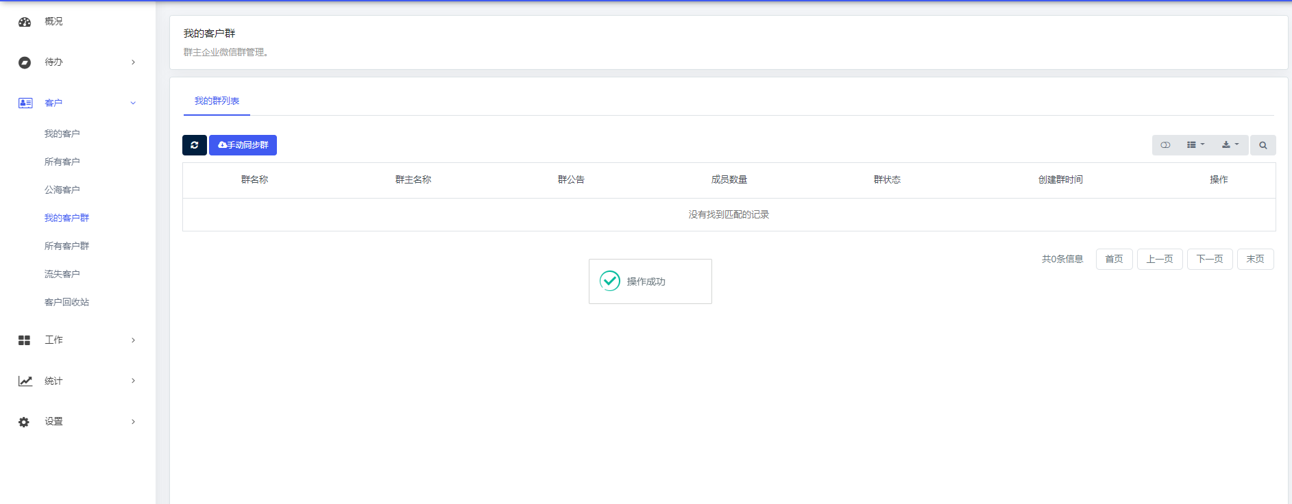 捍示:此功能仅针对员工账号,如使用管理员账号在此页面是看不到任何客户群信息的。 我的客户群:显示员工本人所创建的群,显示群名称、群主、成员数量、群状态、创建时间等