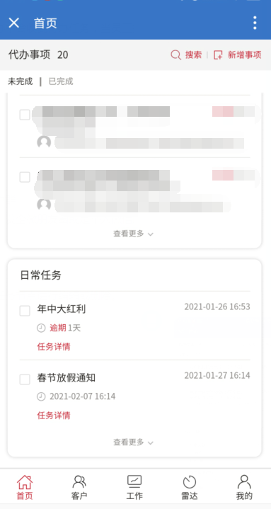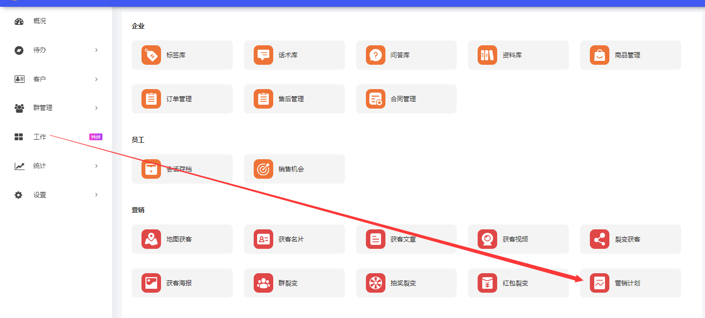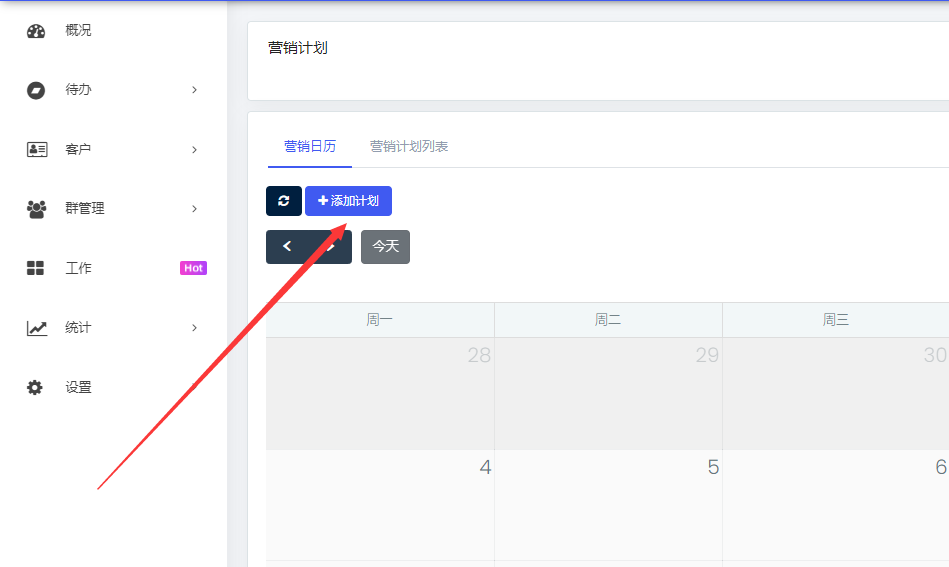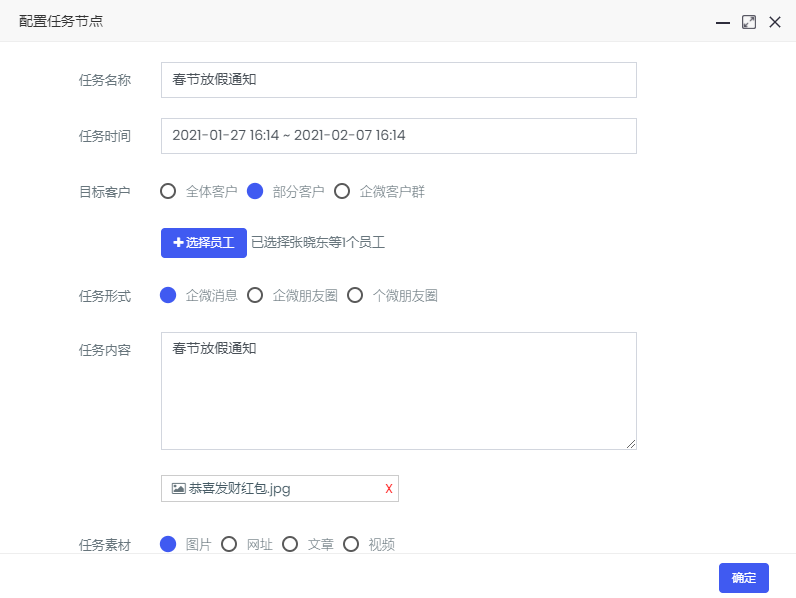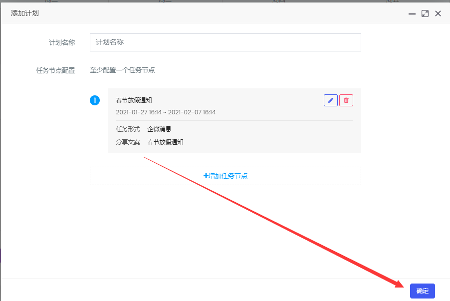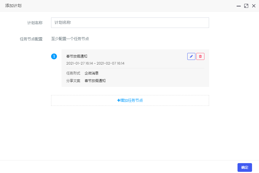 流程说明:管理员在企业微信SCRM后台添加营销任务,员工在企业微信SCRM的待办中会收到待办任务,当员工完成任务之后,点击完成即可。 一、在企业微信SCRM后台打开【工作-营销计划】页面,【添加】营销计划   二、点击增加任务节点(一个计划可以添加多个任务节点)  任务名称:任务名称 任务时间:员工需在规定时间内完成任务并点击【完成】 目标客户:可以选择所有员的客户,或是部分员工的客户,或是企微客户群 任务形式:告诉员工是通过哪种方式完成任务,通过企业微信发送消息、发企微朋友圈或是个人微信朋友圈。 任务内容:任务的详细说明或描述。 任务素材:完成任务需要的图片、网址、文章链接或是视频文件。  三、配置完成一个任务节点后,可以添加第二个任务,或是对已添加的任务节点进行编辑或删除。  以一个任务节点为例,点击【确定】保存  四、员工在企业微信SCRM手机端或PC端首页上可看到日常待办有待完成的任务,点击前边的复选框,可完成任务  五、营销计划表中,可看到所有已添加的计划任务,