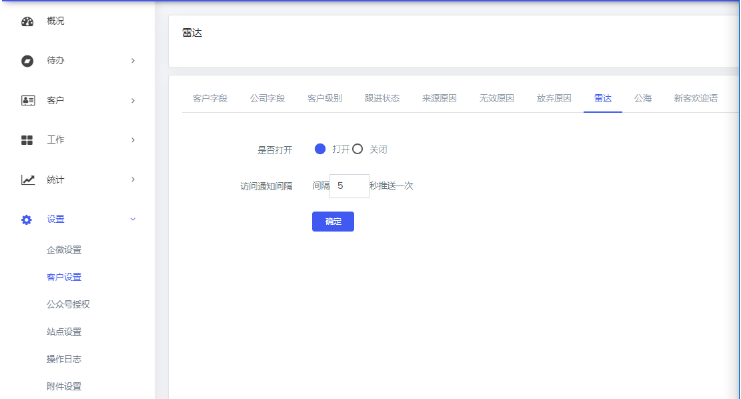 可以设置雷达提醒是否开启/关闭,以及访问通知间隔 当用户访问获客文章或是获客视频时,会有相关的雷达提醒。