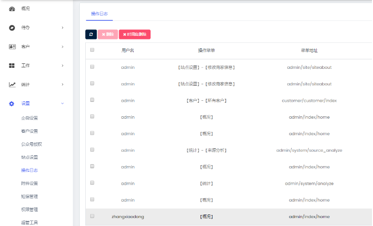 此页面可查看所有用户在不同时间进行的不同操作的详细记录、包括用户名、操作菜单、菜单地址、IP地址、浏览器、操作时间以及详情等。管理员可查看所有用户的操作记录,普通用户仅能查看自己的操作记录