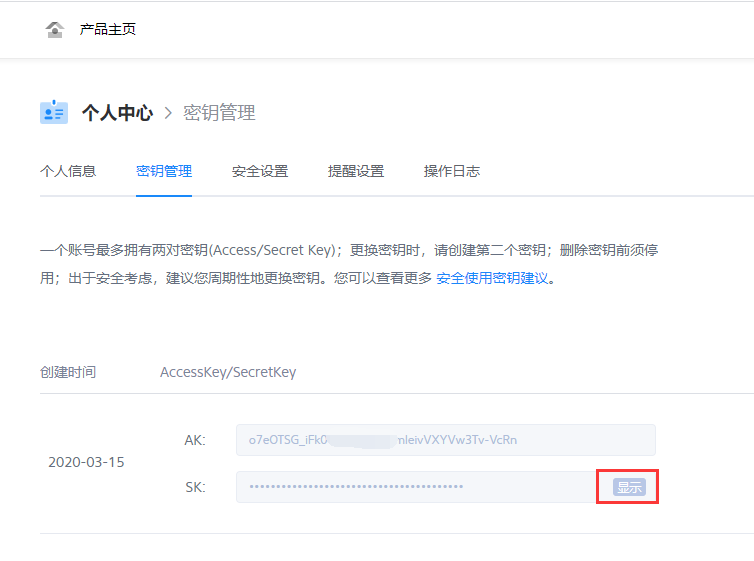 一、登录七牛云官网www.qiniu.com,进入控制台,点击右上角头像,进入【密钥管理】  二、在【密钥管理】页面点击【显示】按钮,获取AK和SK信息  三、登录独立版本系统后台,打开【附件设置】页面,选择【七牛云存储】,然后将AK和SK信息复制到对应的位置,然后填写空间名称和空间绑定的域名  四、测试配置,保存信息,完成