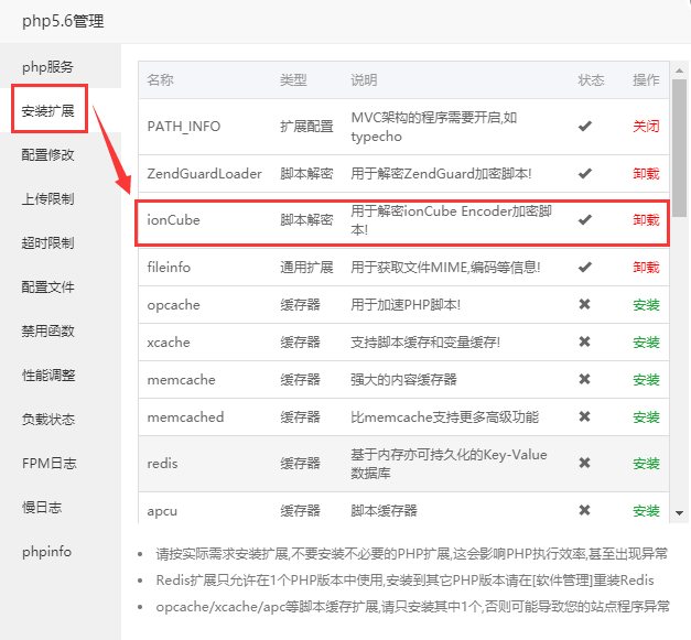 一、登录宝塔面板,查看站点使用的哪个版本的PHP  二、打开软件管理页面,找到对应的PHP版本,点击设置  三、找到安装扩展选项卡,查看ioncube插件是否安装,如果未安装的话,点击安装,然后重启PHP即可。