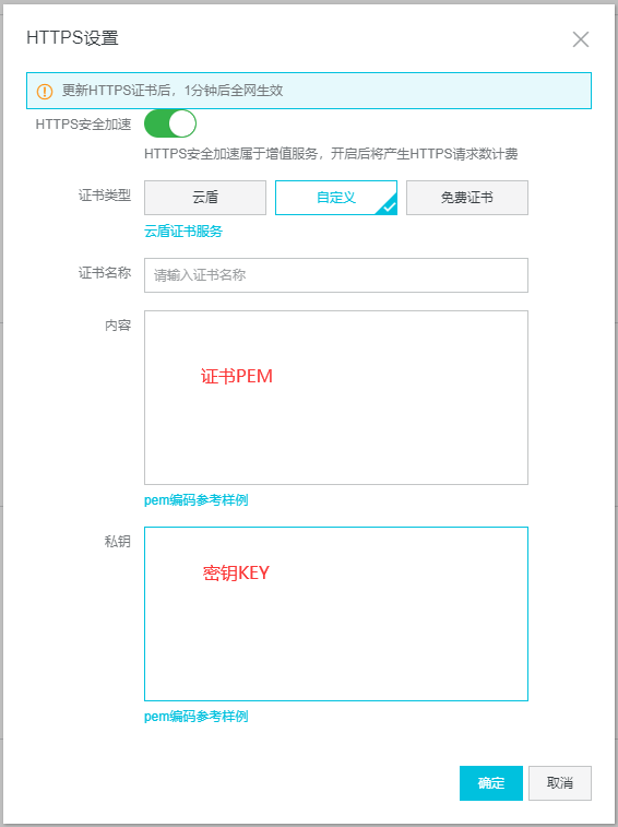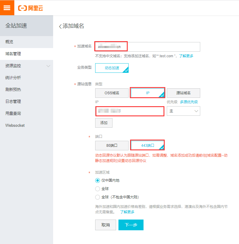 一、开通阿里云CDN全站加速 二、购买全站加速资源包  三、打开【全站加速】首页,进行【添加域名】操作  四、填写站点域名,源站信息选择【IP】,然后填写服务器IP地址,端口选择433,然后下一步  五、加速域名添加成功,返回域名列表,进行CNAME配置  六、根据系统生成的CNAME记录,复制一下记录,进行域名解析修改  七、修改之前的域名解析记录,将记录类型由A记录改为CNAME,填写记录值(刚才复制的CNAME记录)  八、返回【全站加速】域名管理列表,刷新页面可看到状态【正在运行】,可进行下一步配置https  九、开启https,可以申请阿里云免费的证书,也可以上传站点已有的SSL证书  十、如果使用站点之前的证书文件,将之前的内容复制到自定义证书对应的框中即可   十一、配置成功
