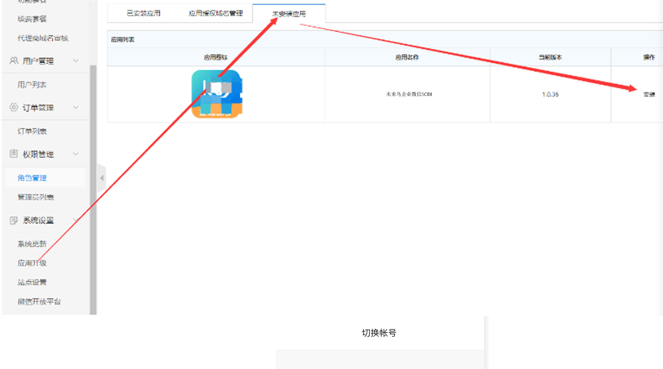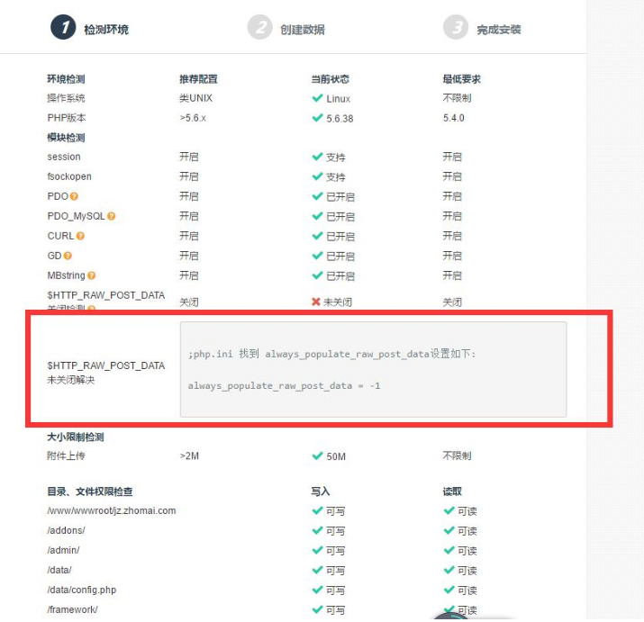 一、下载系统框架安装包,登录宝塔,新建站点绑定域名,注意php选择5.6 ##提示:安装系统框架之前,需要确认站点对应的PHP是否安装最新版本的ionCube插件 ##提示:安装前需关掉站点防火墙/防篡改功能 ##提示:系统配置Php5.6 Mysql5.6 二、然后将安装包上传至新建站点的根目录下(解析域名、ssl域名证书配置需自行配置)  ~~~~ 二、将压缩包解压,然后打开浏览器输入站点域名,开始安装(推荐谷歌或QQ浏览器)  三、下一步,检测站点环境及配置(如初次安装会有部分PHP配置需要调整,根据提示修改即可,也可参考文末第九段的解决办法)  四、填写数据库名、密码和数据库用户名及管理员信息,进行创建数据操作  五、系统框架安装完成。  六、使用刚才设置好的管理员账号、密码登录系统后台。  七、登录后台之后,先将系统升级到最新版本。  八、点击左侧菜单【应用升级】-【未安装应用】,点击【安装】即可(可先将系统框架更新至最新版本)  九、大概需要十分钟左右,即可完成企业微信SCRM应用安装  如果出现下图所示的【请先安装ionCube解密插件】,请参考文档【ionCube插件安装】(左上角搜索)  十、如果初次安装未来鸟智慧建站系统,检测环境时会出现下图所示的情况  宝塔面板可以直接打开软件管理页面,找到PHP5.6,点击设置  修改PHP5.6的配置文件,找到always_populate_raw_post_data,把分号去掉,保存,重启PHP即可(windows面板的话,找到php5.6所在文件夹,打开php.ini,找到always_populate_raw_post_data,修改为always_populate_raw_post_data=-1,保存php.ini,重启WEB服务即可。)