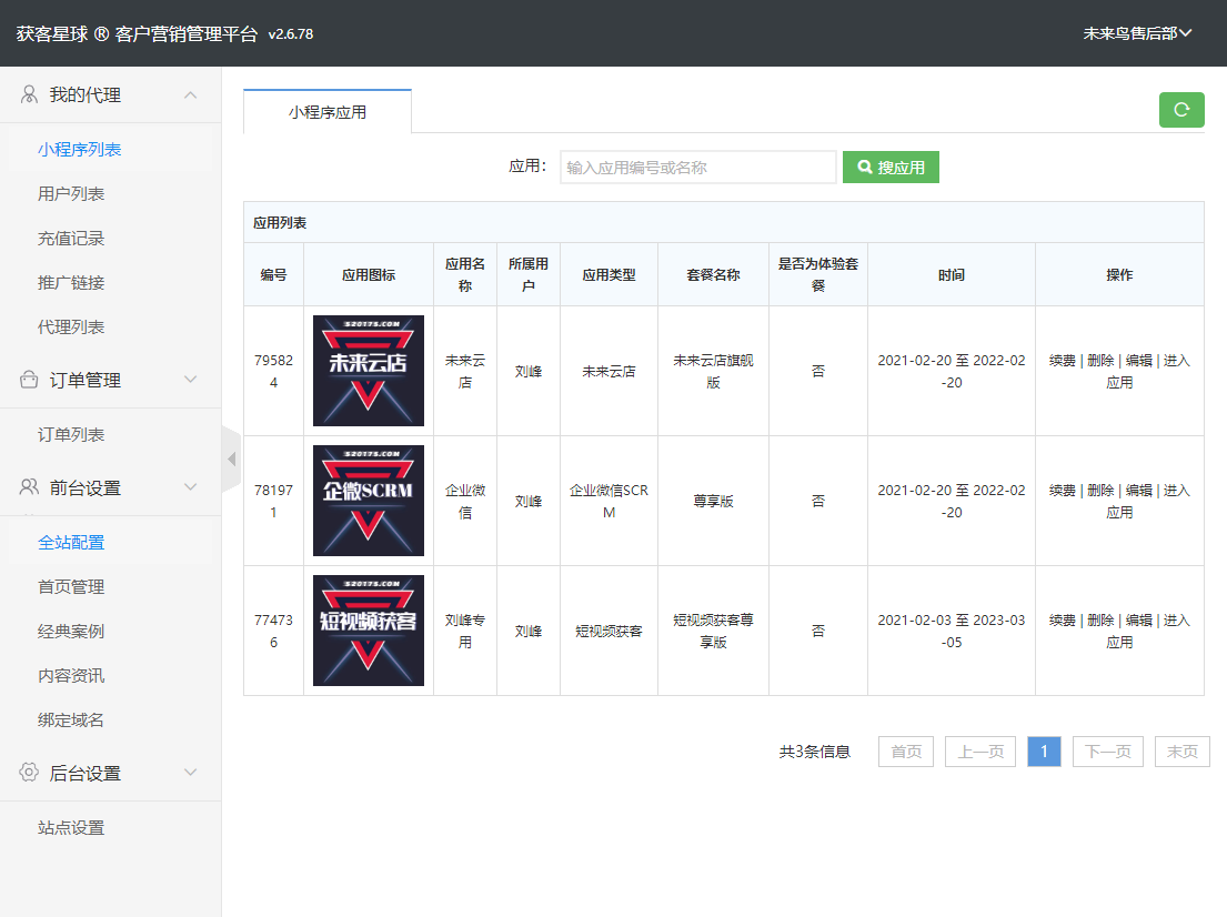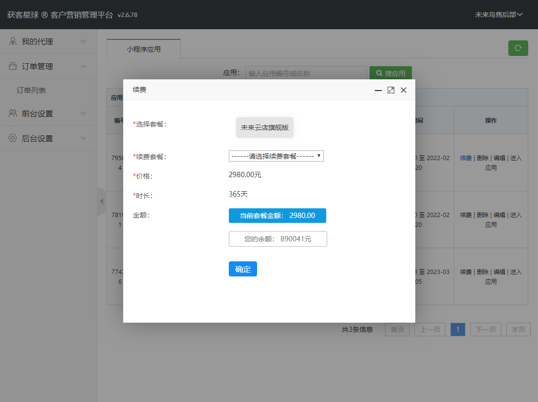 一、在独立版后台,打开【小程序应用】页面,找到需要续费的小程序应用,查看当前小程序使用的套餐名称,如当前套餐名称为【普通用户一年版本】。  二、在【续费套餐】页面,点击】添加续费套餐】,填写套餐名称,选择相应的应用及套餐,设置价格及时间,点击【提交】按钮  三、在【小程序应用】列表找到需要续费的小程序,点击【续费】链接,在弹出窗口中选择刚创建好的续费套餐,点击【确定】,完成续费操作。