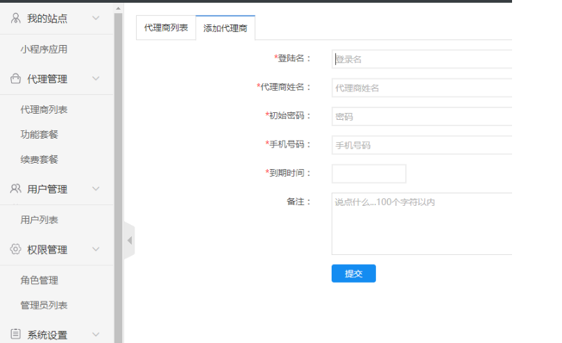 一、填写登录名、代理商姓名、初始密码、手机号,并设置到期时间和备注,【提交】保存即可