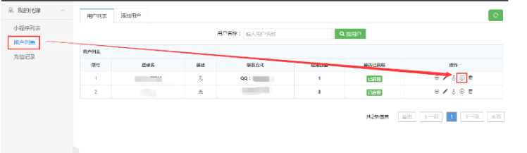 代理商登录账号,点击用户列表的创建小程序按钮,即可为用户创建小程序