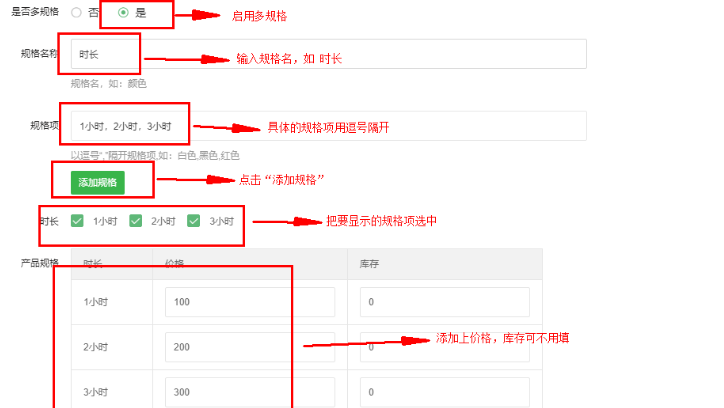 后台服务项目多规格使用教程效果如下 1)打开后台 2)服务项目 3)添加服务  浏览第4)- 10)以及下方截图 4)多规格选择“是” 5)规格名称填上,如“时长” 6)规格项填上,规格项之间用逗号隔开,如“1小时,2小时,3小时” 7)点击“添加规格”按钮 8)界面会显示出刚设置的规格名称和规格项,选中需要的规格项 9)界面会显示各规格项的价格表 10)填上各规格项的价格,库存不需要填