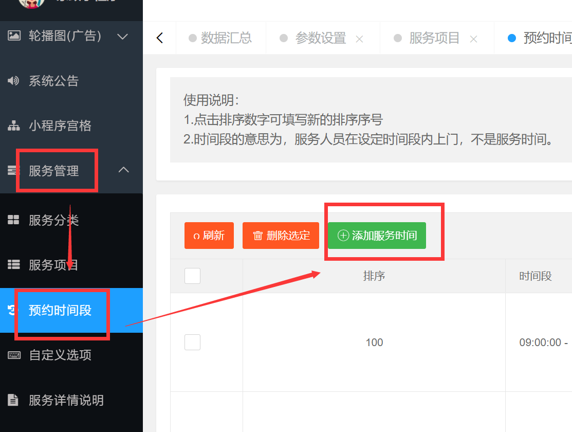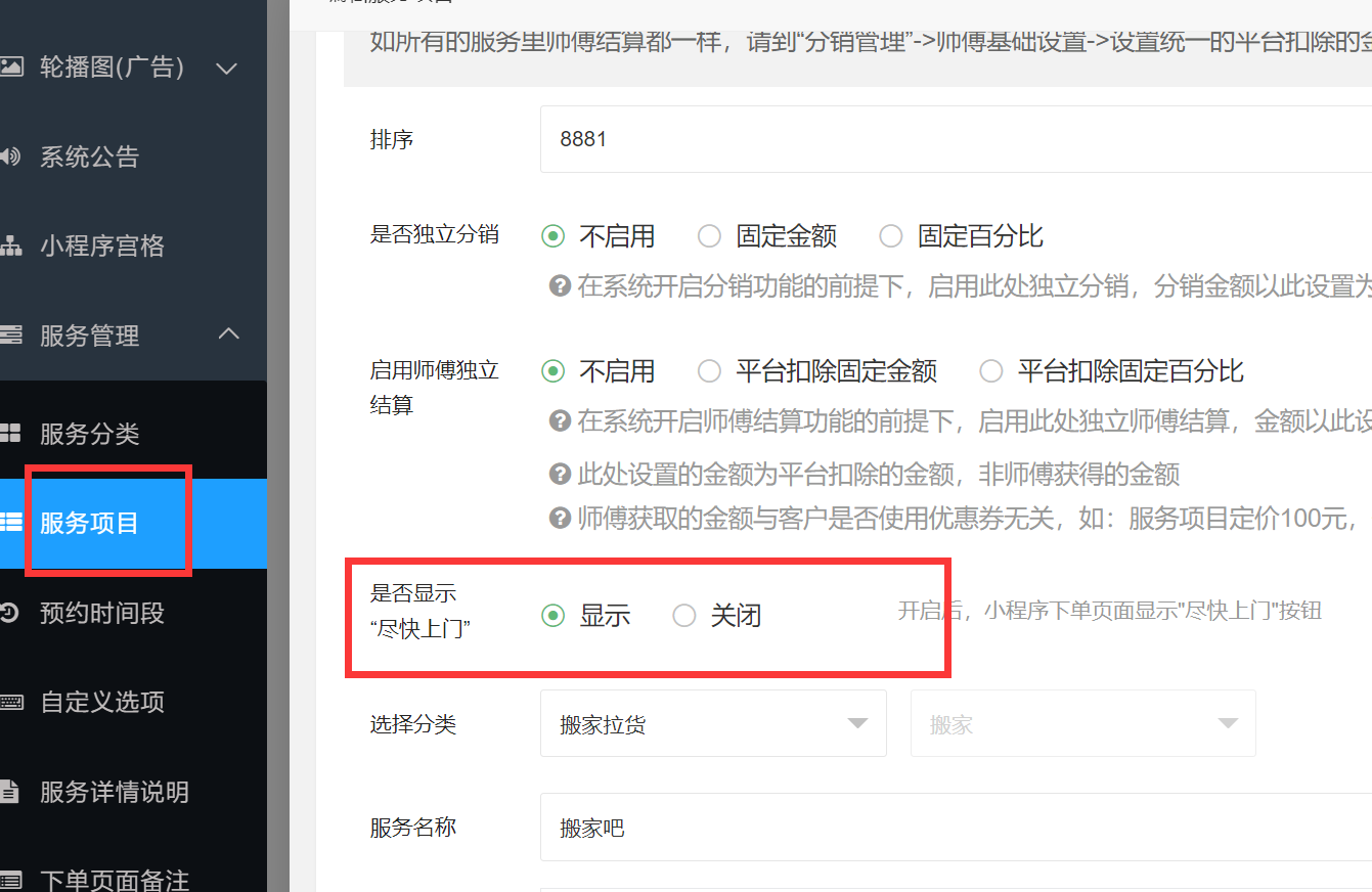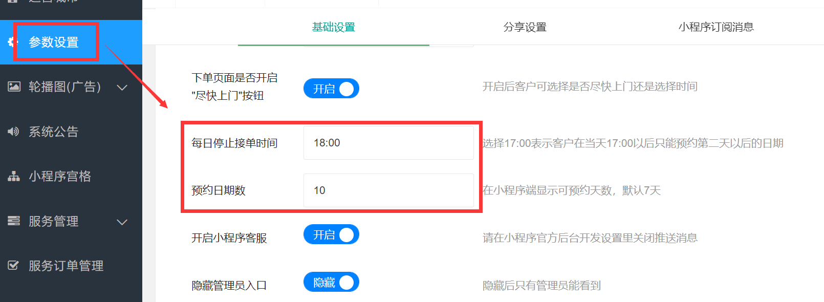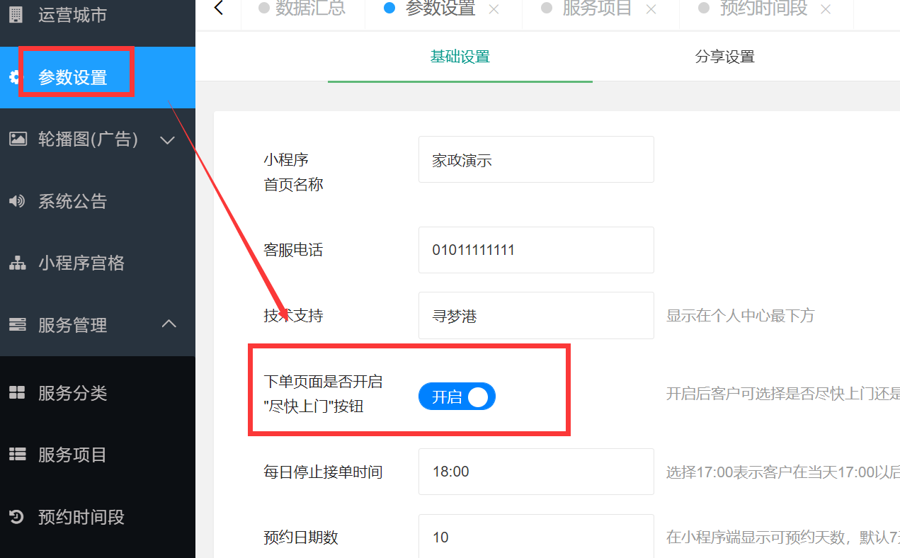 尽快上门和预约时间段 ## 1. 时间段设置 ### 1) 系统默认开启预约时间段 ### 2) 时间段预约规则设置 参数设置内 设置好每日停止接单时间和可预约填上(看好后面的备注)  ### 3) 添加时间段 服务管理 预约时间段 添加服务时间  ## 2. 尽快上门设置 ### 1) 参数设置里开启  ### 2) 服务项目内开启  ## 3. 管理员操作修改上门时间 管理员后台和小程序管理员可在后台和小程序里 修改时间和上门类型 以及 更换师傅