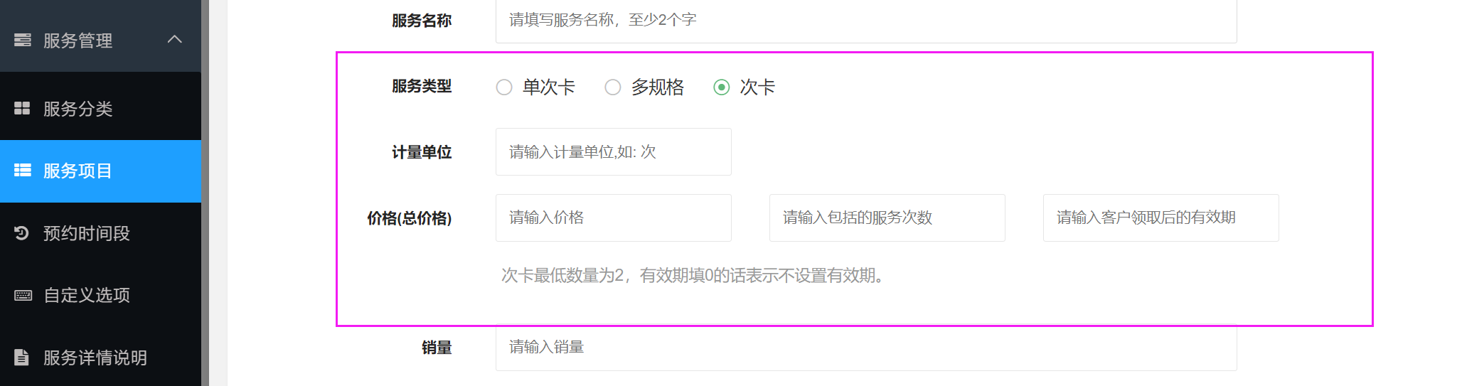 1、服务项目内选择次卡 v  2、计量单位必填,如次、件、桶这种 3、价格指数的是总价格 4、服务次数指的是可服务的次数 5、有效期,填写天数,填写0表示为永久有效 6、次卡未使用客户可以申请退款小程序管理员审核退款 2、计量单位必填,如次、件、桶这种 3、价格指数的是总价格 4、服务次数指的是可服务的次数 5、有效期,填写天数,填写0表示为永久有效 6、次卡未使用客户可以申请退款小程序管理员审核退款 7、客户在小程序个人中心常用工具我的次卡里查看次卡和退款 8、客户使用次卡下单流程:进入我的次卡选择去使用选择次数等提交订单,余流程与普 通下单相同 9、当次订单完成后给师傅和分销商结算当次订单分成 10、 客户使用次卡下单后取消订单的话管理员审核通过后返回相应次数