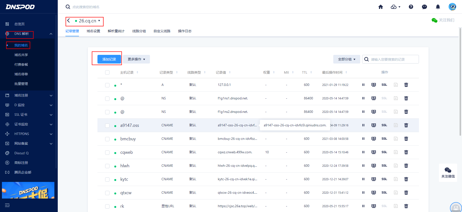 ## 1.登录DNSPod _1617939586.jpg) ## 2.点击DNS解析,进入我的域名  ## 3.进入后点击添加记录  ## 4.添加主机记录,记录类型:(CNME:别名)记录值(客户提供)权重(10),点击确定  ## 5.登录七牛云,点击CDN加速  ## 6.点击域名管理,配置完成后进入配置页面  ## 7.点击HTTPS配置,开启全部配置,  ## 8.HTTPS配置完成后,点击图片配置,关闭配置即可