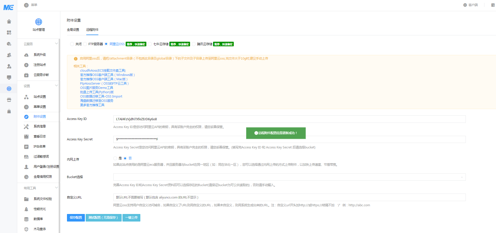 阿里云OSS 1.【站点设置】———【附件设置】——【远程附件】——【阿里云OSS】  2.访问阿里云选择【产品】——【存储】——【对象存储OSS】  3.点击【Bucket列表】——【创建Bucket】,填写【Bucket名称】,选择【区域】,读写权限选择【公共读写】,其他方面根据自己需要选择  4.创建完成Bucket后,可以直接通过预览查看阿里云默认分配的bucket域名(默认的URL在微擎内是不需要填写的)  5.【传输管理】——【域名管理】——【绑定域名】,自定义添加域名  6.点击右上角头像选择【AccessKey】查看Access Key ID和Access Key Secret,如果没有选择新建即可   7.将Access Key ID和Access Key Secret填到微擎内对应位置,选择已创建好的Bucket后,点击测试配置,显示配置成功后,说明参数没有问题,点击确定,选择保存配置即可完成配置