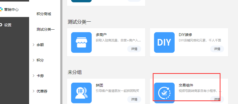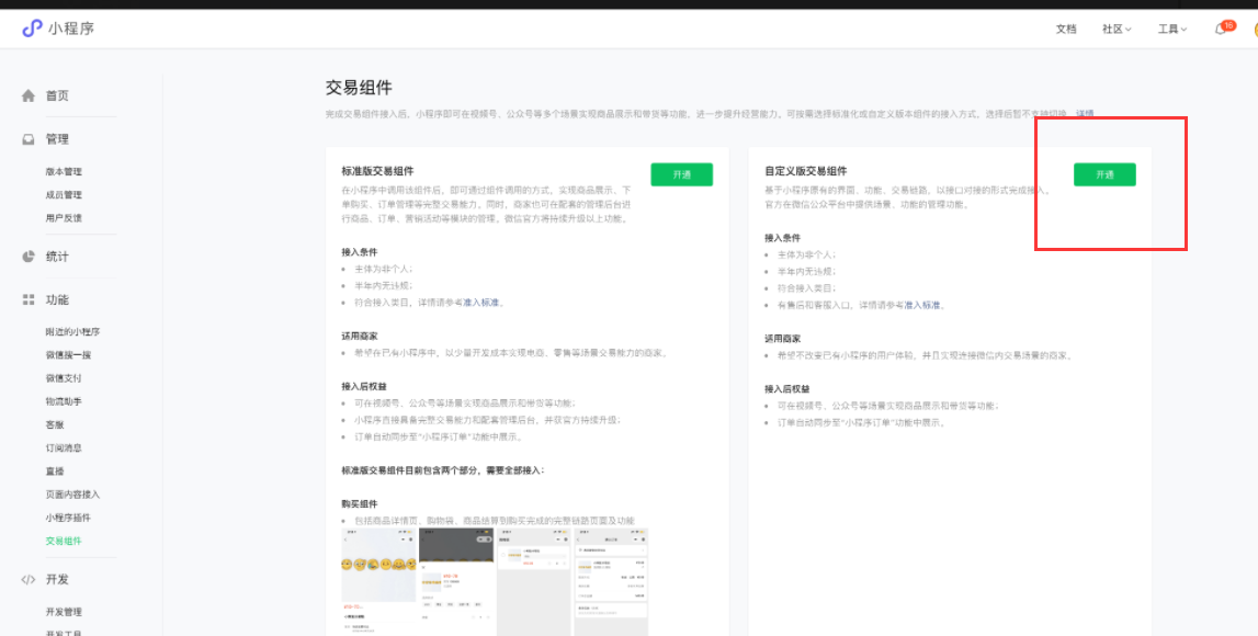 ### 关于自定义交易组件  ==首先,商家需要在微信后台申请自定义版交易组件权限,申请成功后,可以将小程序关联至对应视频号,并在视频号带货直播中使用。==  选择自定义版交易组件,并申请开通功能,进入审核流程。商家也可以通过调用申请接入的接口申请开通功能,申请并审核通过后会看到下面的界面。   若申请开通显示不在白名单,可以厂商填写内测表格 https://wj.qq.com/s2/7722332/ea93/ 其次,接入小程序的视频号要求是企业认证的视频号,且视频号认证主体和微信小程序认证主体一致,或者视频号的管理员和小程序的管理员一致。 若使用了第三方授权小程序方式,请在三方勾选自定义交易组件权限,然后重新授权小程序; 当交易组件开通之后, 首先在我们后台上传商品审核:   审核通过之后,进入微信小程序下单,必须用微信支付,任意商品下单就行 即可完成接口调用 完成之后可以通过企业视频号-我的商店进入  其他用户进入微信视频号主页,可以看到“商店”入口,点击进入,就能直接跳转到通过榜店商城系统发布的小程序。  开启视频号直播时,直播页面底部可显示商品图标,用户点击“商品”,便能直接进入小程序进行下单购买。 在用户进入小程序购物的同时,直播窗口会缩小并悬浮于右下角,用户可以一边抢购,一边继续看直播。  借助视频号直播直接跳转小程序的功能,商家可以在视频号直播中,让用户实现即看即买,缩短交易路径,一站式转化。