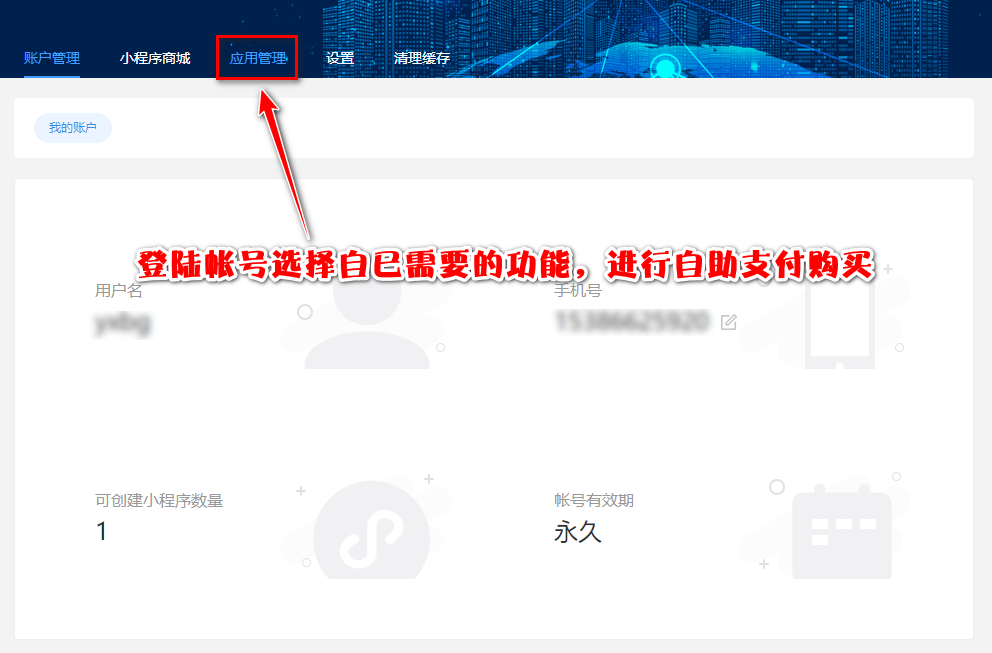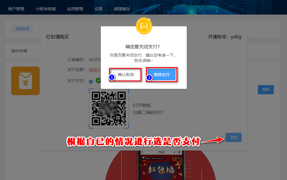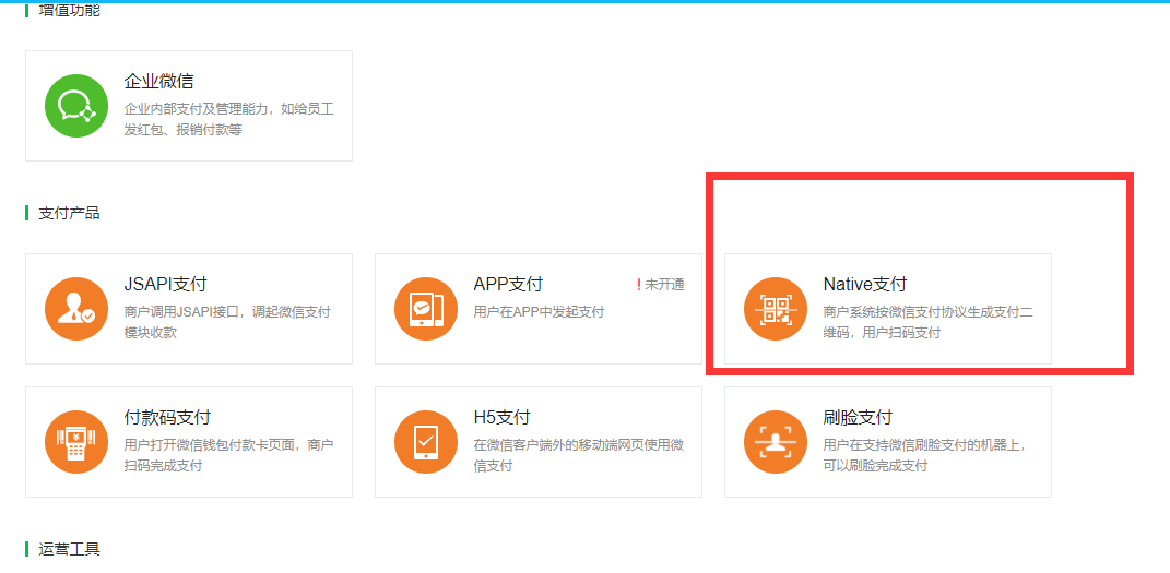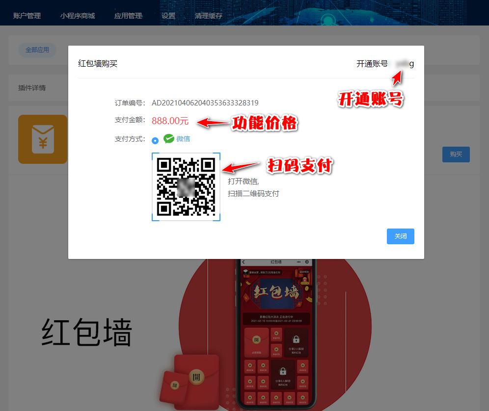 功能自动开通 用户可以通过自助购买方式,开通想用的功能,不再需要人工客服的干预,更加人性化。 进入应用管理  选择对应功能模块,进行支付购买对应应用。  3.打开对应模块进行扫码支付,支付方式可以是微信,也可以是支付宝支付。  扫码支付 支付需要开通特定产品: 支付宝开通:  微信开通:  支付配置参考公众号h5功能那边的微信跟支付宝配置链接  如需要取消支付,点关闭即可