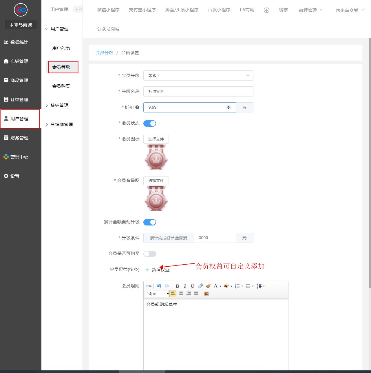 ### 1、进入商城,添加会员等级   ### 2、进入商品管理-商品列表添加指定购买商品   ==注:商品设置其他地方设置不变,主要区别在购买设置上== ### 3、录入客户资料   ### 4、进入前端小程序搜索指定产品即可购买 注意:正常会员等级升级是按照订单完成后开始计算