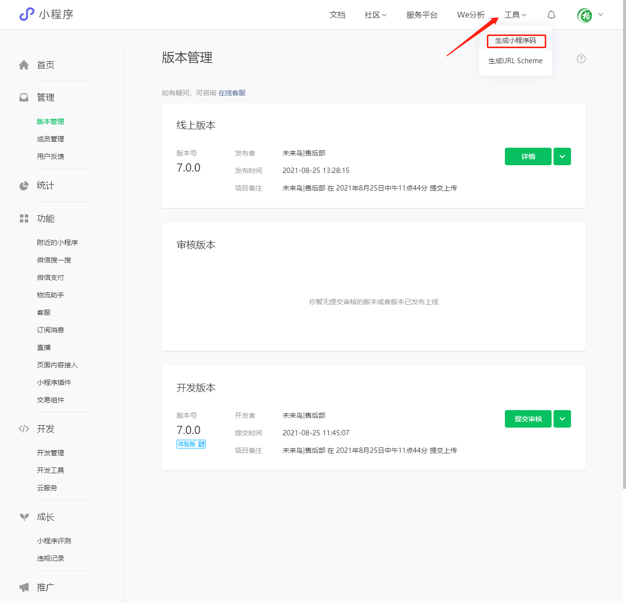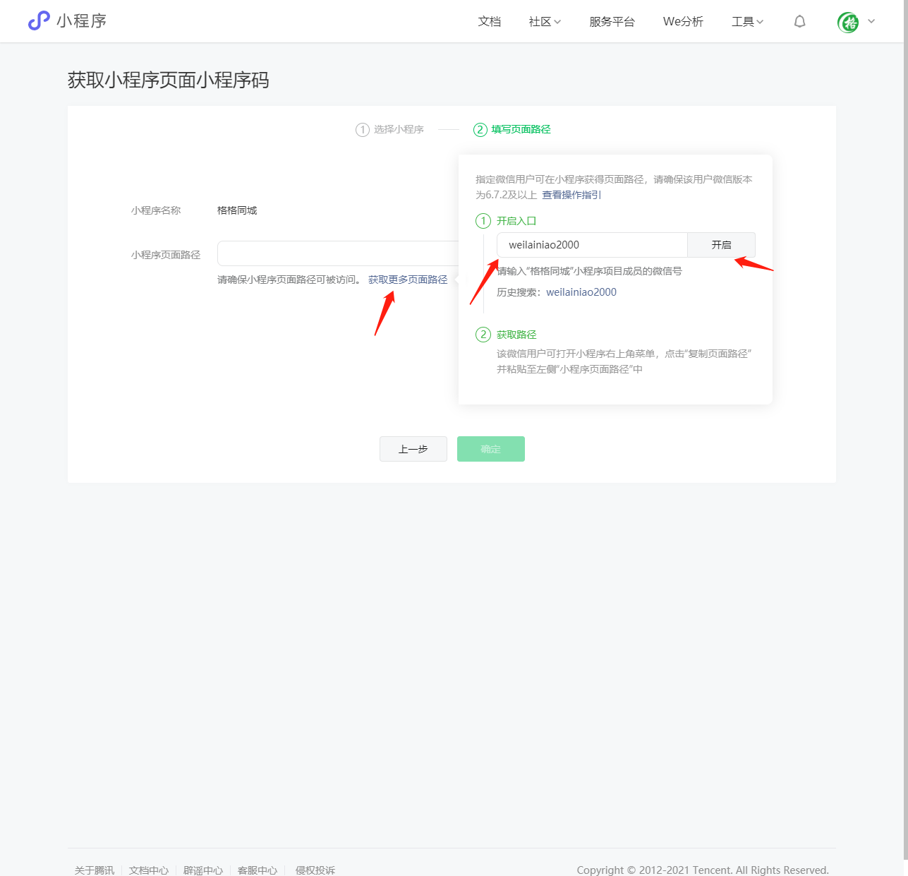 ## 1.进入微信公众平台登录小程序https://mp.weixin.qq.com  ## 2.登录小程序后,点击右上角工具,成小程序码,输入小程序名称或者小程序APPID进入下一步  点击获取更多页面路径,输入获取页面路径项目成员微信号,点击开启即可  ## 3.用刚刚输入的微信号打开对应小程序,进入需要路径页面,点击右上角的小点,复制页面路径  ## 4.将刚刚获取到的页面路径去掉后面的 .html 即可。