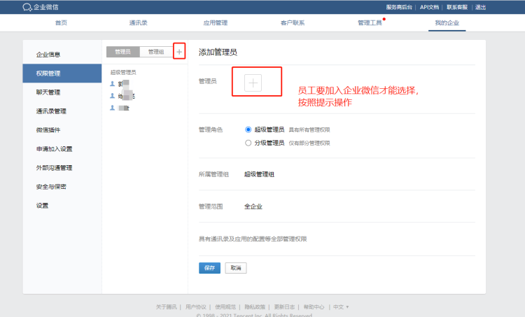 第一步:打开登录网址 https://wxcrm.499w.net/index.html#/l【修改自己的站点】 第二步:打开企业微信或者个人微信,扫码登录。  注意 如出现【当前微信账号未注册企业】请到企业微信后台添加该微信号为管理员。 企业微信后台添加方式如下图: 点击添加