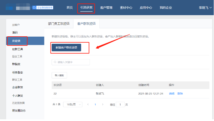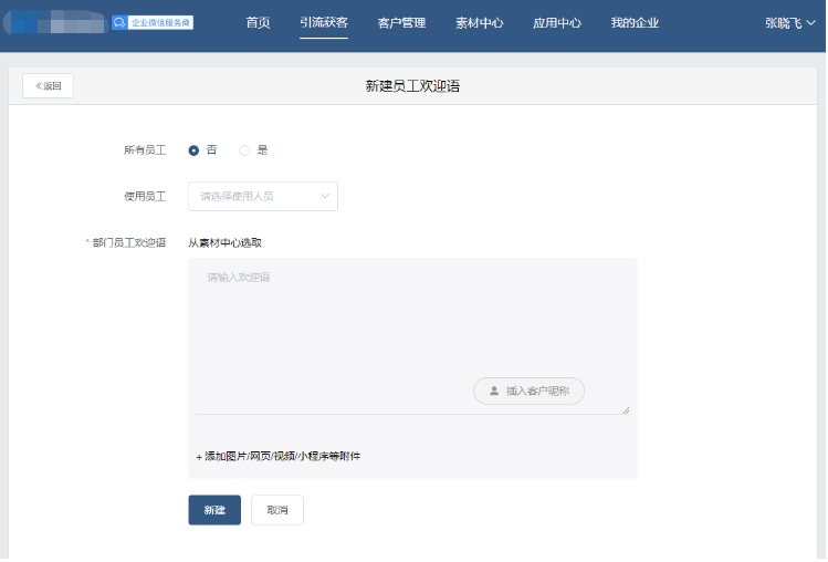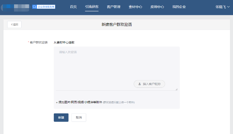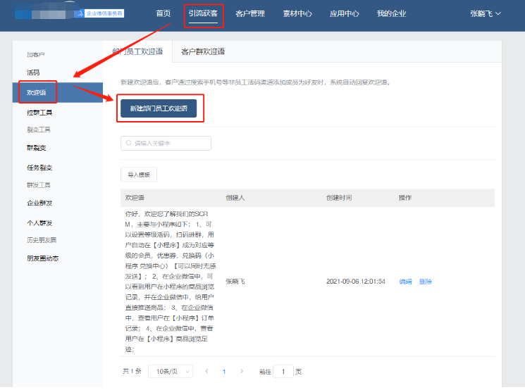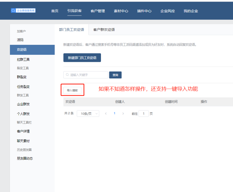 您好,欢迎使用未来鸟电商SCRM系统 未来鸟电商SCRM基于企业微信帮助企业打造集客户增长、客户运营、客户转化、客户管理于一体的私域增长闭环系统 覆盖企业客户运营的全生命周期,实现客户数增长、销售额增长 请您严格按照下方流程进行配置,如有任何问题,请联系您的专属客服。 好友欢迎语功能简介 好友欢迎语是用户主动添加企业微信成员后,企业微信成员号自动向用户发送的欢迎信息,让用户在添加的第一时间,感受到温暖服务。 ● 可以为不同成员配置不同的欢迎语功能,实现千人千面的差异化运营,用户添加不同的员工,收到不同的欢迎语,提升用户好感度。 ● 一次可以发送10条信息,一条文字消息+9条附加话术(支持图片、图文链接、小程序、表单、红包),通过附加消息,可以让用户第一时间就开始了解企业 ## 部门员工欢迎语配置流程: ### 1.新建好友欢迎语 登录未来鸟电商SCRM后台—引流获客—欢迎语—新建部门员工欢迎语  ### 2.配置好友欢迎语内容 可以配置所有员工、使用员工、部门员工欢迎语、插入配置,从素材中心中选取等功能。 (1)所有员工,可以设置所有员工统一欢迎语,或者设置不同。 (2)使用员工,可以下拉选择员工,或者在输入框内进行搜索名字找到对应的员工信息并选择。配置之后,用户添加该成员,自动触发该欢迎语内容 (3)部门员工欢迎语:配置欢迎语的文字信息,可点击【插入客户昵称】,插入到文字信息中,提升用户好感 从素材中心选取:可选择话术类型(图片、图文、网页、视频、小程序)  ### 3.首次使用,不知道如何设置欢迎语内容,可以通过以下界面,直接导入模板。  ## 新建客户群欢迎语 ### 1.新建客户群欢迎语 登录未来鸟电商SCRM后台—引流获客—欢迎语—新建客户群欢迎语  ### 2.配置客户群欢迎语内容 配置欢迎语的文字信息,可点击【插入客户昵称】,插入到文字信息中,提升用户好感 从素材中心选取:可选择话术类型(图片、图文、网页、视频、小程序),注意群欢迎语只能上传一个附件  ### 3.首次使用,不知道如何设置欢迎语内容,可以通过以下界面,直接导入模板。