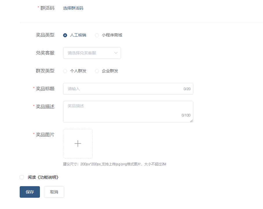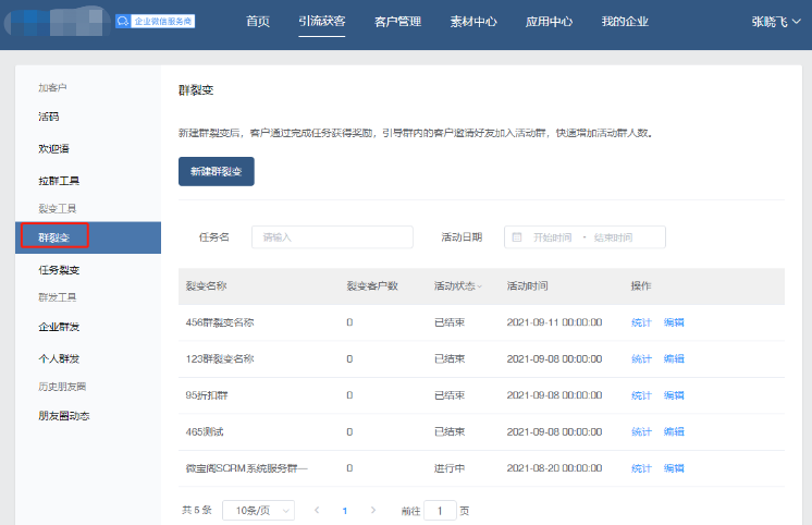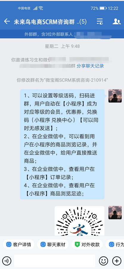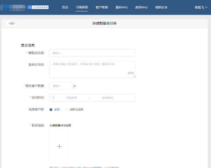 您好,欢迎使用未来鸟电商SCRM系统 未来鸟电商SCRM基于企业微信帮助企业打造集客户增长、客户运营、客户转化、客户管理于一体的私域增长闭环系统 覆盖企业客户运营的全生命周期,实现客户数增长、销售额增长 请您严格按照下方流程进行配置,如有任何问题,请联系您的专属客服。 群裂变与任务裂变的区别:群裂变通过拉新用户加入群聊获得奖品,任务裂变则是通过拉新用户添加企业微信成员微信获得奖品。 ## 群裂变功能简介 ### 1.什么是群裂变? 企业在社群运营的过程中,可以使用群获客功能进行引流获客 通过群内用户主动转发分享活动海报,邀请潜在用户进群,实现快速拉群,提升群内的用户量的增长。让客户沉淀再社群内,规模化建立社群客户池。 通过有吸引力的奖品,邀请多个好友入群助力,好友扫海报二维码,达到入群人数后可免费获得奖品,以此诱导用户在自己的社交圈进行传播,一传二、二传四的模式,指数级增长。 使用场景包含:福利群、快闪群等社群场景、直播群、训练营等预约报名社群 ### 2.群裂变用户参与路径 点击链接/扫推广码进入活动详情页参与活动——点击立即入群——添加企业成员企业微信(此时企业内成员推送引导入群文案+活动链接)——点击链接进入活动详情页扫码进群(此时群主发送获客文案+活动链接)——用户点击链接进入活动详情页——点击分享海报邀请助力——助力成功领取奖品 ## 活动配置流程 ### 1.新增企业微信外部群 在创建群裂变活动前,您需要在企业微信创建外部群。  ### 2.新增群裂变 点击微宝阁SCRM后台—引流获客—群裂变—新建群裂变  ### 3.设置基本信息 设置群裂变名称、裂变引导语、裂变客户数量、活动时间、选择客户群、裂变海报、群活码、奖品类型、兑奖客服、群发类型、奖品标题、奖品描述、奖品图片。 (1)群裂变名称:记录任务名称 (2)裂变引导语:选填,用于引导客户参与活动 (3)裂变客户数量:输入人数即可 (4)活动时间:选择开始和结束时间 (5)选择客户群:可以全部,或者按照群主选择 (6)裂变海报:可以直接添加,或者从海报素材中选取  (7)群活码:此处直接选择对应的群活码即可,如没有群活码可以选择,需要先去进行添加 (8)奖品类型:人工核销的话,就是线下操作即可。也可以选择小程序商城,对应选择会员等级,发送优惠券、兑换中心即可。  (9)兑奖客服:下拉选择即可 (10)群发类型:个人群发和企业群发。企业群发是一次性发送给到所有用户,一个月只可使用4次。个人群发,每天可以使用一次,则是员工会收到一条消息,需要员工点击转发。 (11)奖品标题:输入奖品标题 (12)奖品描述:输入奖品描述 (13)奖品图片:添加奖品图片