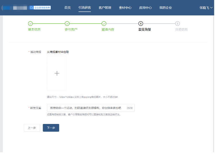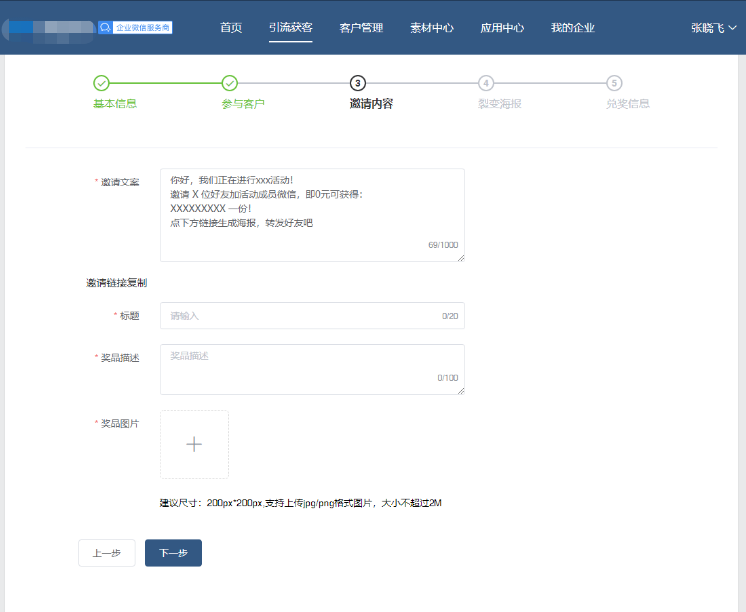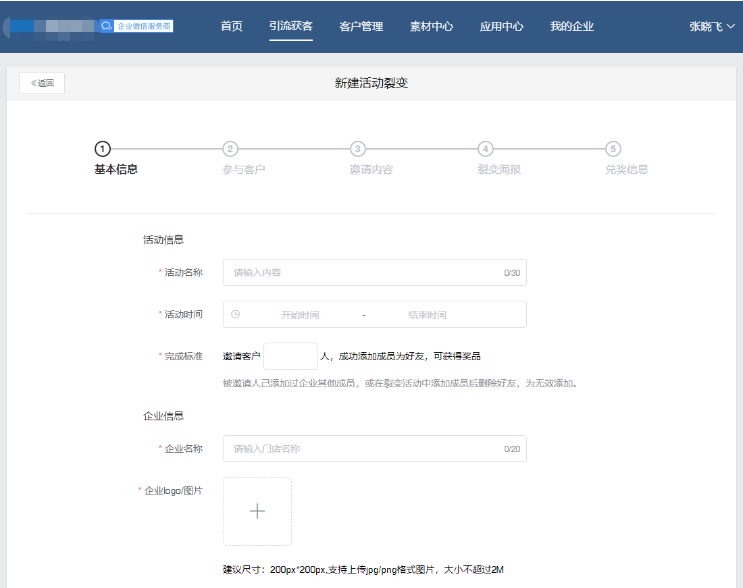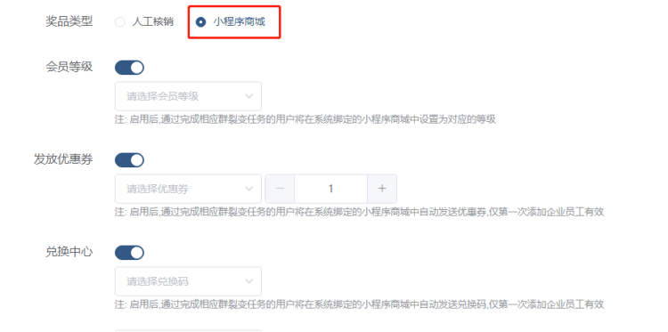 您好,欢迎使用未来鸟电商SCRM系统 未来鸟电商SCRM基于企业微信帮助企业打造集客户增长、客户运营、客户转化、客户管理于一体的私域增长闭环系统 覆盖企业客户运营的全生命周期,实现客户数增长、销售额增长 请您严格按照下方流程进行配置,如有任何问题,请联系您的专属客服。 群裂变与任务裂变的区别:群裂变通过拉新用户加入群聊获得奖品,任务裂变则是通过拉新用户添加企业微信成员微信获得奖品。 ## 任务裂变简介 任务裂变:通过有吸引力的奖品,邀请多个好友助力(即好友添加企业成员),达到目标人数后可免费获得,以此诱导用户在自己的社交圈进行传播,一传二、二传四的模式,指数级增长。主要应用在各类产品促销、新品推广、课程销售等场景,获得大范围活动转发、引爆传播。、 ## 任务裂变配置流程 ### 1.新建任务裂变 登录微宝阁SCRM后台—引流获客—任务裂变—新建任务裂变  ### 2.配置基本信息 (1)活动名称:记录活动名称 (2)活动时间:选择开始和结束时间 (3)完成标准:输入人数即可,成功添加成员为好友,可获得奖品 (4)企业信息:填写企业名称,添加企业LOGO  ### 3.设置参与客户信息 (1)参与裂变老客,可以选择全部客户,或者按照条件筛选客户。条件筛选可以选择添加人跟标签  (2)邀请参与方式:分企业群发跟个人群发。企业群发是一次性发送给到所有用户,一个月只可使用4次。个人群发,每天可以使用一次,则是员工会收到一条消息,需要员工点击转发。  (3)新客添加设置:新客添加的员工,可下拉选择,或者输入员工名字查找,支持添加多个员工。  (4)自动通过:开启后,新客添加员工企业微信,无需确认自动成为好友  (5)新客参与设置:可以选择自动邀请新客裂变,不邀请新客参与裂变。邀请的话,新客也可以参与到裂变活动中 (6)新客标签:可以给新客打上对应的活动标签,方便后续进行客户跟踪营销 ### 4.设置邀请内容 (1)邀请文案:填写邀请文案 (2)邀请链接复制标题:输入相关内容 (3)奖品描述:填入奖品的介绍 (4)奖品图片:上传奖品的图片  ### 5.设置裂变海报 (1)活动海报:可以直接添加,或者从海报素材中选取 (2)转发文案:可以默认,或者自行修改,该文案将在客户分享裂变海报时可以直接粘贴文案发送给好友。  ### 6.设置兑奖信息 (1)奖品类型:人工核销和小程序商城。人工核销的话,就是线下操作即可。也可以选择小程序商城,对应选择会员等级,发送优惠券、兑换中心即可。  (2)兑奖客服二维码:添加客服二维码 (3)兑奖规则:按照实际情况修改下规则,完成后,点击通知员工发送即可