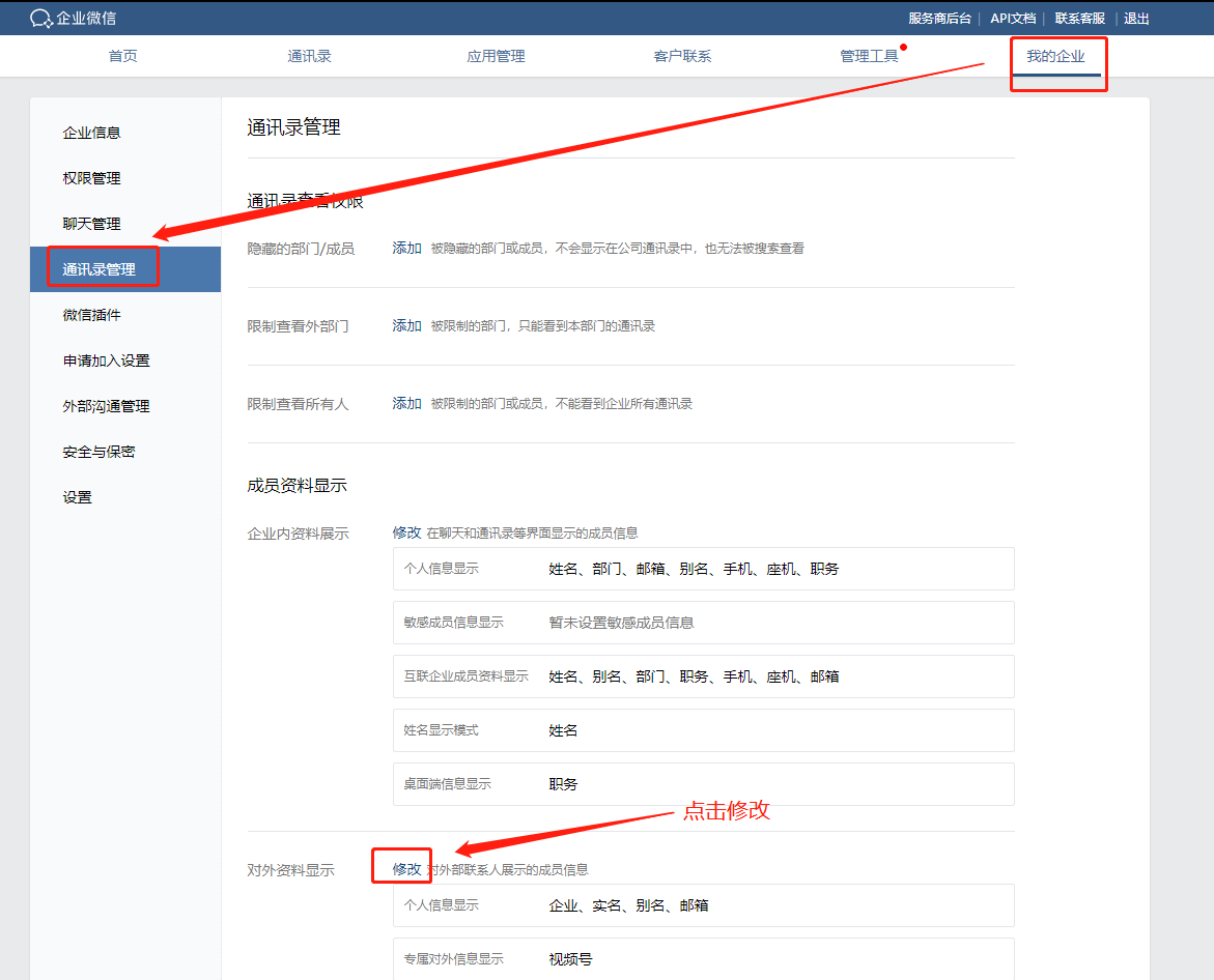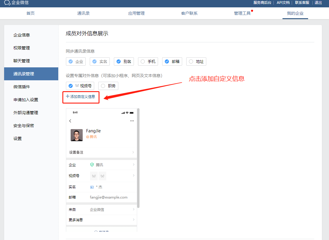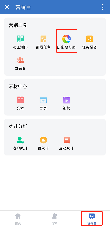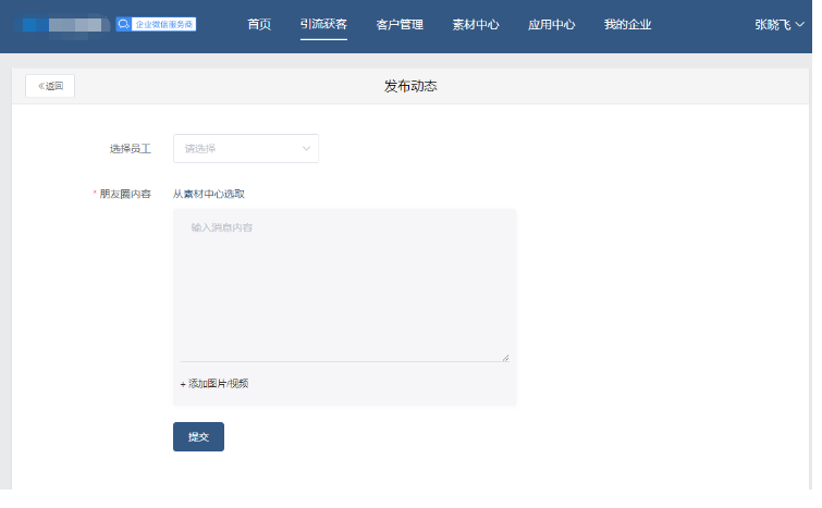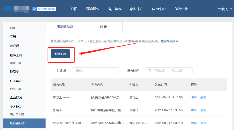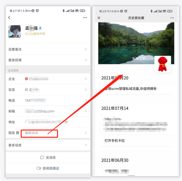 您好,欢迎使用未来鸟电商SCRM系统 未来鸟电商SCRM基于企业微信帮助企业打造集客户增长、客户运营、客户转化、客户管理于一体的私域增长闭环系统 覆盖企业客户运营的全生命周期,实现客户数增长、销售额增长 请您严格按照下方流程进行配置,如有任何问题,请联系您的专属客服。 ### 朋友圈动态功能简介 企业微信朋友圈展示功能可以配置在员工企业微信主页, 弥补 弥补企业微信缺失的“历史朋友圈”功能 ● 客户添加好友后,可以在个人信息页进入朋友圈,查看“朋友圈”发布记录,企业微信上的好友,也可以进入“朋友圈”,体验感与普通微信朋友圈一致 ● 可以通过朋友圈的内容展示,可以帮助企业微信号快速传递重要信息,打造统一或鲜明的风格人设,提高用户好感度、促进成交转化,是企业微信客户运营必备的功能 ● 一天发布的条数没有限制,内容也可以随时发布、删除 ## 朋友圈动态配置流程 企业微信朋友圈的配置,分为企业微信后台、未来鸟电商SCRM后台、员工手机端三个部分,我们逐一来看! ### 1.配置成员对外朋友圈入口 (1)管理员登录企业微信后台(网址https://work.weixin.qq.com/),在我的企业—通讯录管理—对外资料显示  (2)点击修改,选择添加自定义信息  (3)建议填写名称为朋友圈或XX朋友圈,选择类型为网页,点击保存  ### 2.设置企业微信手机端 完成修改后,返回企业微信手机端,打开对外信息显示,填写朋友圈网页信息;该栏需要输入网页名称,建议填写“查看企业动态”  ### 3.获取朋友圈地址 后台管理员可一键发送、导出、复制员工的朋友圈地址。 员工将朋友圈链接粘贴到对外信息显示的朋友圈列表内,这样客户打开员工的对外资料,就能看到员工发布的朋友圈。  完成以上3个配置步骤,即成功配置朋友圈信息展示,下面是实际展示效果  创建好企业微信朋友圈入口,即可进行发布朋友圈内容![] 进入企业微信工作台—未来鸟电商SCRM—营销台—历史朋友圈   ## 朋友圈动态操作流程 ### 1.新建动态 登录未来鸟电商SCRM后台—引流获客—朋友圈动态—新建动态  1.配置朋友圈动态内容 (1)选择员工:可下拉选择员工 (2)朋友圈内容:可从朋友圈素材中选择,可添加文本内容、图片、视频  ## 朋友圈动态设置流程 ### 1.设置默认个人信息 登录未来鸟电商SCRM后台—引流获客—朋友圈动态—设置 用于设置朋友圈背景图片,跟朋友圈头像