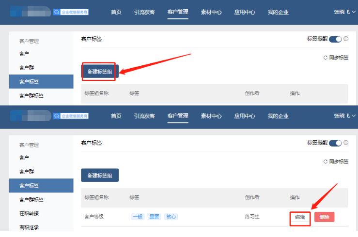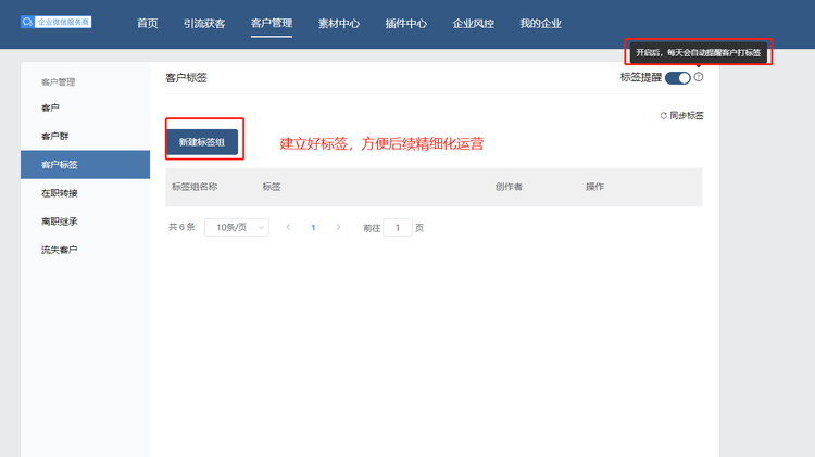 您好,欢迎使用未来鸟电商SCRM系统 未来鸟电商SCRM基于企业微信帮助企业打造集客户增长、客户运营、客户转化、客户管理于一体的私域增长闭环系统 覆盖企业客户运营的全生命周期,实现客户数增长、销售额增长 请您严格按照下方流程进行配置,如有任何问题,请联系您的专属客服。 ### 功能简介 老板/管理员/运营可在微宝阁SCRM后台设置标签组及标签,通过标签精细化运营企业整个私域流量池的客户情况,销售/导购可在和客户交流过程中,主动给客户打上标签,方便后期针对标签去做精细化运营,群发等。 ## 1.同步企业微信后台标签信息 点击微宝阁SCRM后台—客户管理—客户标签—右上角同步标签  ### 2.标签提醒 开启标签提醒后,每天会自动提醒客户打标签  ### 3.添加或修改标签 (1)新建标签组:设置标签组名称 (2)编辑标签:根据需求设置标签组内的标签名称 (3)修改完成后,点击确定即可保存