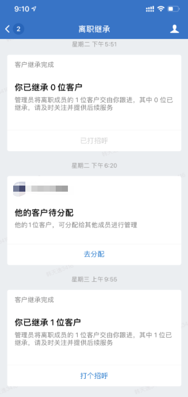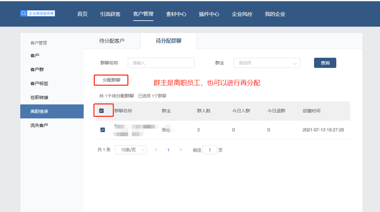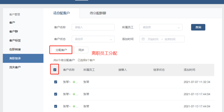 您好,欢迎使用未来鸟电商SCRM系统 未来鸟电商SCRM基于企业微信帮助企业打造集客户增长、客户运营、客户转化、客户管理于一体的私域增长闭环系统 覆盖企业客户运营的全生命周期,实现客户数增长、销售额增长 请您严格按照下方流程进行配置,如有任何问题,请联系您的专属客服。 ## 功能简介 ### 1.什么是离职继承? 企业可将离职成员的客户、客户群转交给其他成员,客户无需操作确认即可直接完成转交。 ### 2.成员离职后分配情况 ● 离职成员客户分配 离职成员客户可直接分配到具有客户联系功能的为离职成员企业微信上 ● 离职成员客户群分配 若成员在创建了客户群,群主离职的情况下,客户群需由管理员分配新群主(新群主需是同企业人员且是客户联系和客户群的使用范围内的成员),若客户群群主离职,管理员未分配新的群主,则这个群的群主不会自动转让群主。 ## 离职继承配置流程 ### 1.点击未来鸟电商SCRM后台—客户管理—离职继承—待分配客户 点击分配客户,可将离职员工名下的客户重新分配 可筛选所属员工,客户状态,添加时间来进行分配  ### 2.微信中收到转接提醒 分配后,离职成员的客户会收到一条通知,如果客户24小时不主动点击【暂不添加】,将在24小时后自动添加新接替的成员为联系人。接替完成后,成员也可查看所有客户的添加情况。 客户会收到以下通知   ### 3.点击未来鸟电商SCRM后台—客户管理—离职继承—待分配群聊 点击分配群聊,可将离职员工名下的群聊重新分配 可筛选群主、群聊名称来进行分配