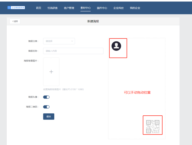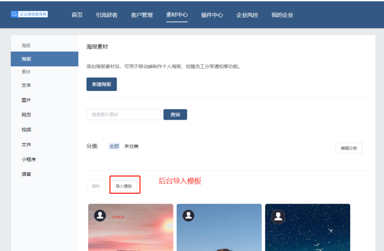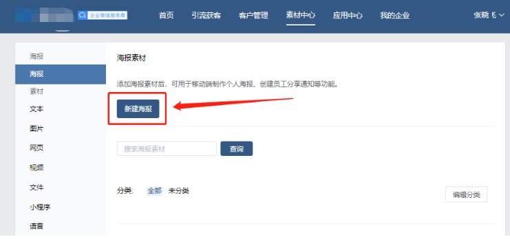 您好,欢迎使用未来鸟电商SCRM系统 未来鸟电商SCRM基于企业微信帮助企业打造集客户增长、客户运营、客户转化、客户管理于一体的私域增长闭环系统 覆盖企业客户运营的全生命周期,实现客户数增长、销售额增长 请您严格按照下方流程进行配置,如有任何问题,请联系您的专属客服。 ## 功能介绍 添加海报素材后,可用于移动端制作个人海报、创建员工分享通知等功能。 ### 1.新建海报 登录微宝阁SCRM后台—素材中心—海报—新建海报