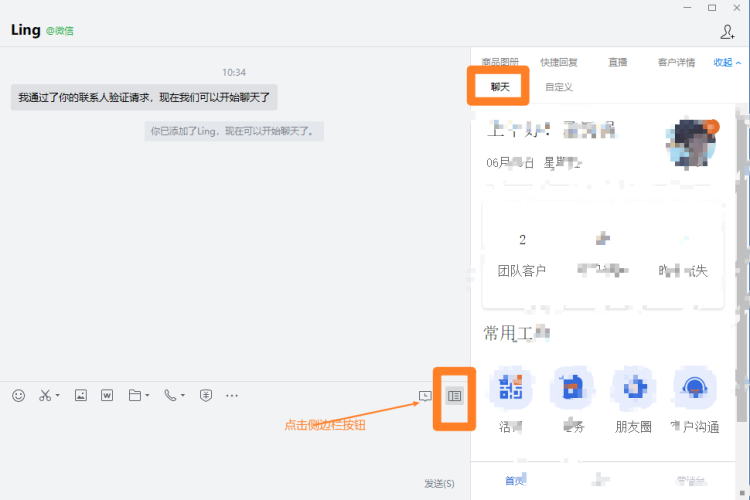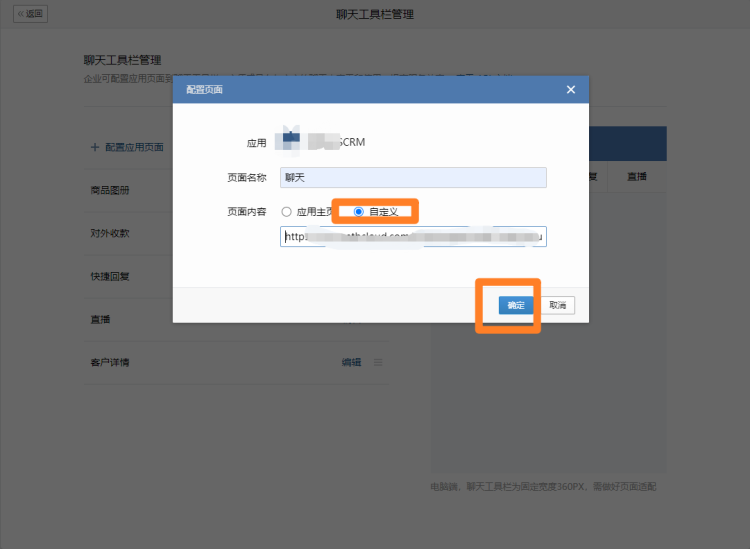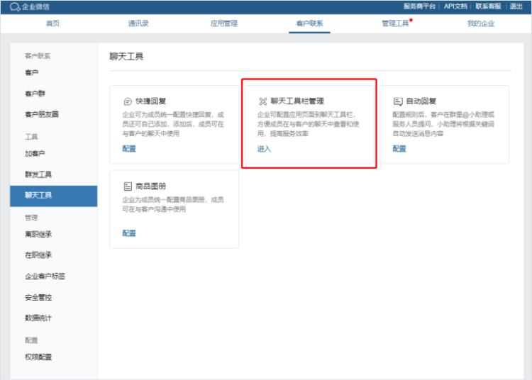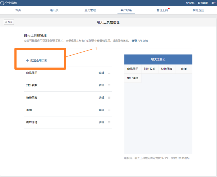 您好,欢迎使用未来鸟电商SCRM系统 未来鸟电商SCRM基于企业微信帮助企业打造集客户增长、客户运营、客户转化、客户管理于一体的私域增长闭环系统 覆盖企业客户运营的全生命周期,实现客户数增长、销售额增长 请您严格按照下方流程进行配置,如有任何问题,请联系您的专属客服。 ## 进入应用中心-系统功能-企业微信侧边栏  ### 侧边栏教程 功能介绍 聊天侧边栏功能集成了企业员工在与客户沟通、服务过程中的常用工具,让员工快速获取客户信息,便捷开展营销活动,提高服务效率。 ### 配置教程 (1) 登录企业微信后台( https://work.weixin.qq.com/wework_admin/frame#apps),点击 【客户联系-聊天工具】进入【聊天工具栏管理】;  (2) 点击 【配置应用页面】,在 【自建应用】下选择 刚刚创建的应用,然后点击 【下一步】 ;   (3) 填写配置页面的信息: 【页面名称】填写该侧边栏名称,【页面内容】选择 【自定义】,在scrm后台 【聊天工具栏】中复制 侧边栏  URL地址粘贴到此处并确定;  (4) 在企业微信 【聊天工具栏管理】中能查看到配置成功的聊天工具栏,以及预览到PC端侧边栏效果;  (5) 配置成功后在PC端企业微信点击侧边栏按钮开启使用,在移动端企业微信文字输入框的上方显示配置成功的聊天侧边栏。  pc端聊天侧边栏