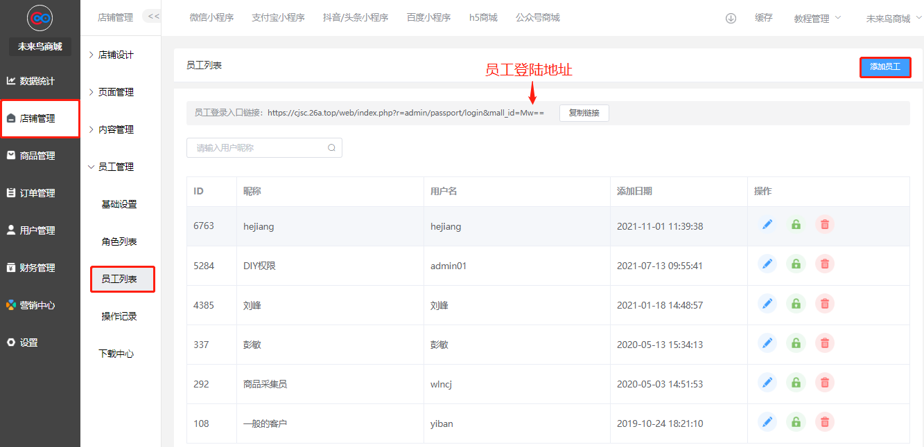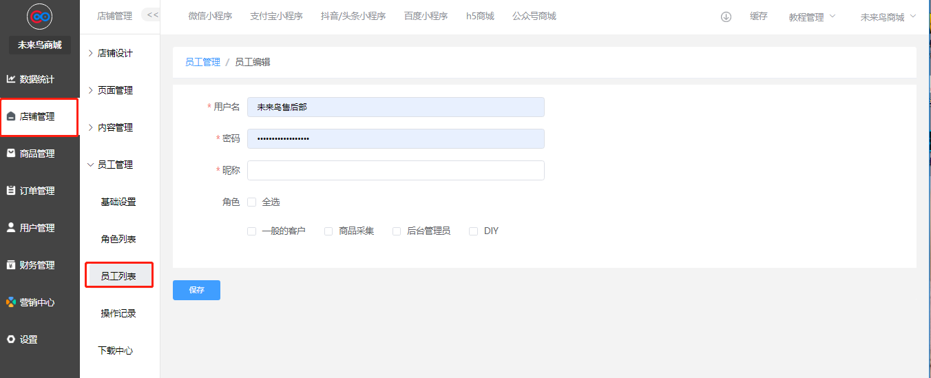 #### 1、添加商城员工,并且更具不同的角色选择不同的操作权限  #### 2、设置员工账号和密码,以及商城管理权限